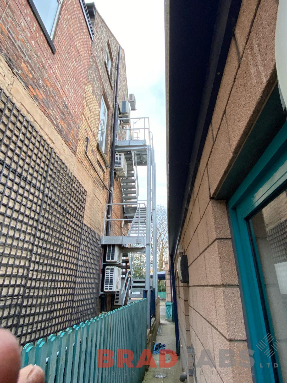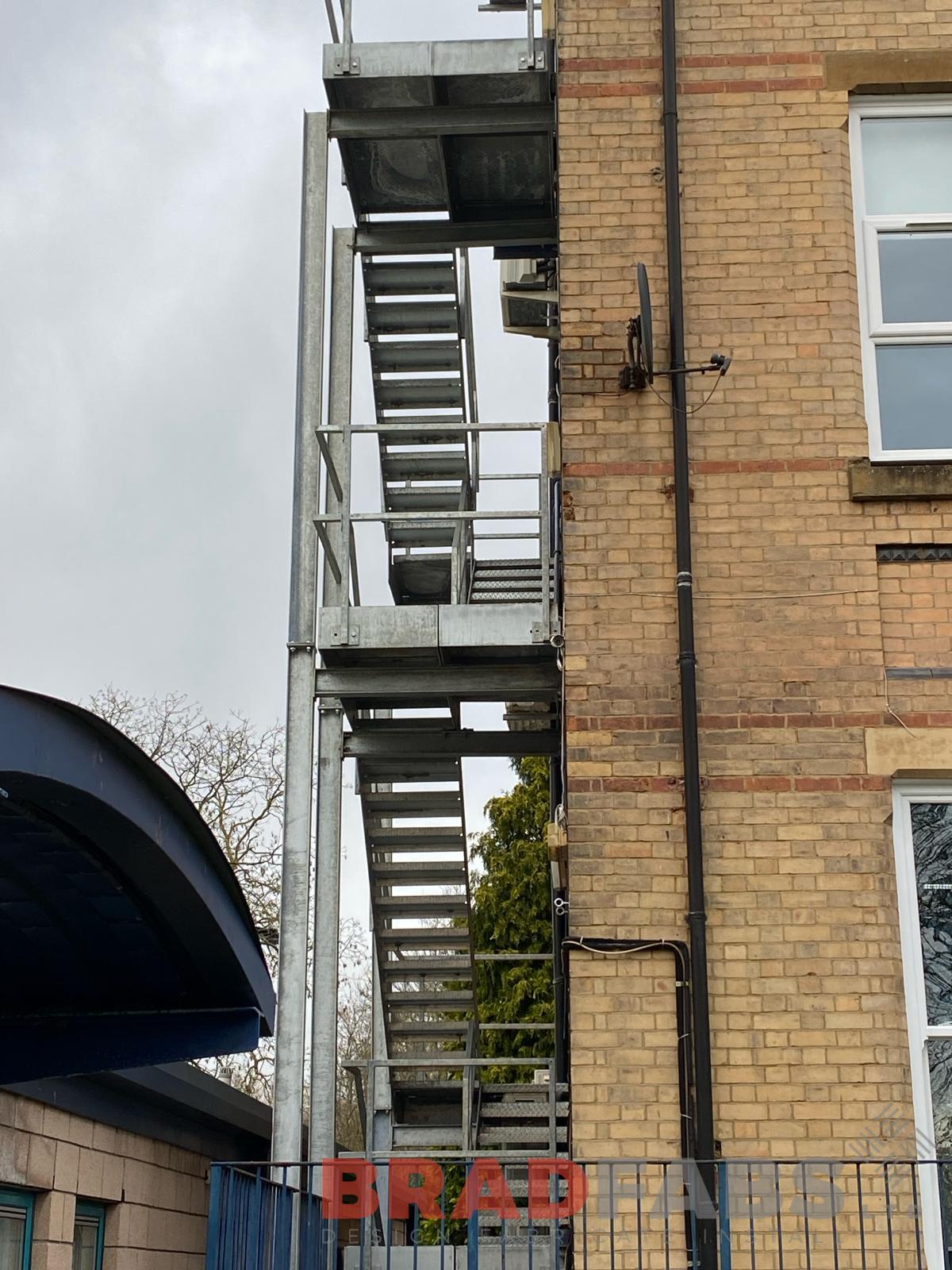 Large, five flight external escape stair for a commercial property, designed, supplied and installed by Bradfabs