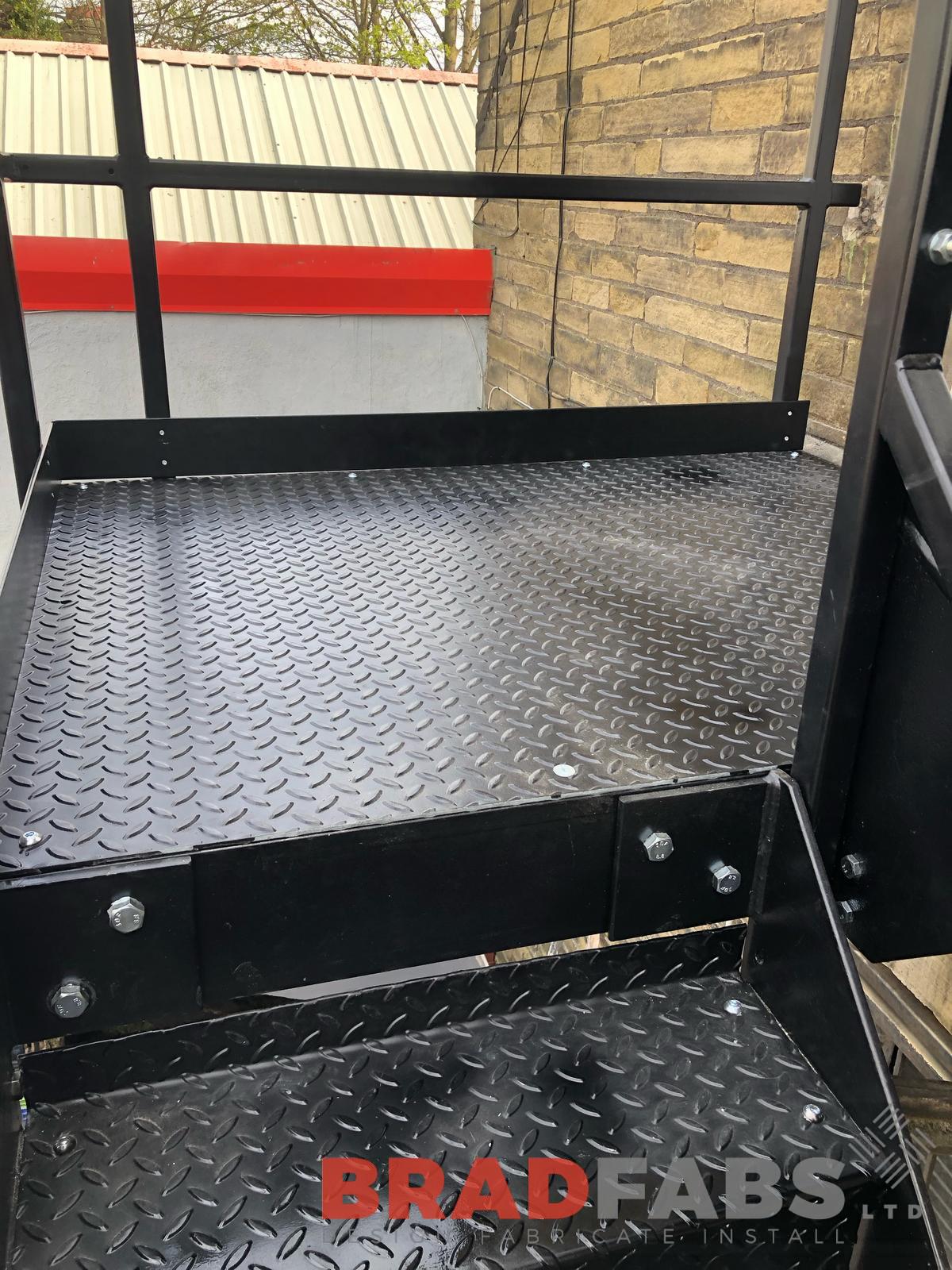 Bespoke cantilevered fire escape access staircase fabricated and installed at a local business. Manufactured in mild steel, galvanised and powder coated with top and mid rail balustrade