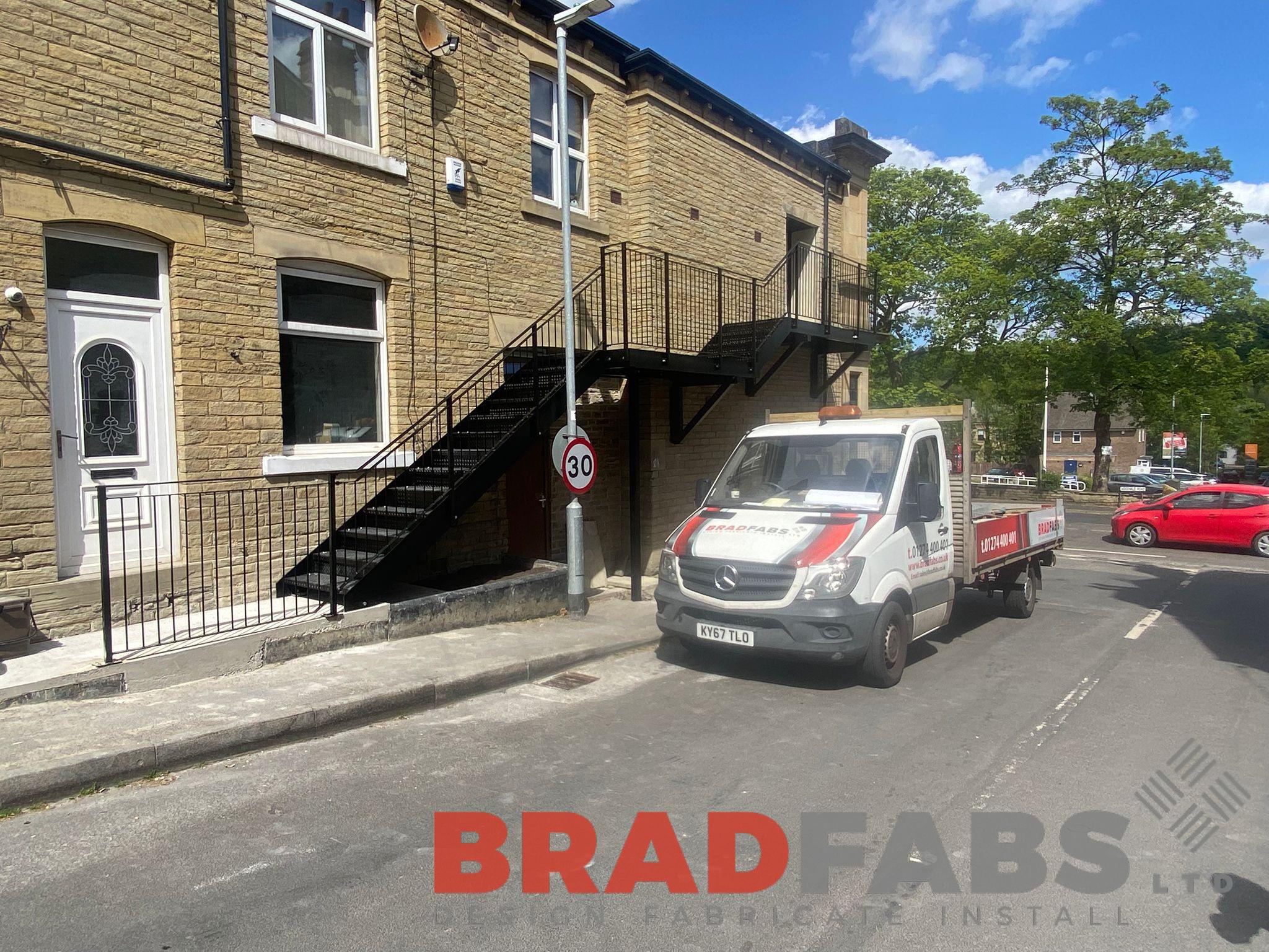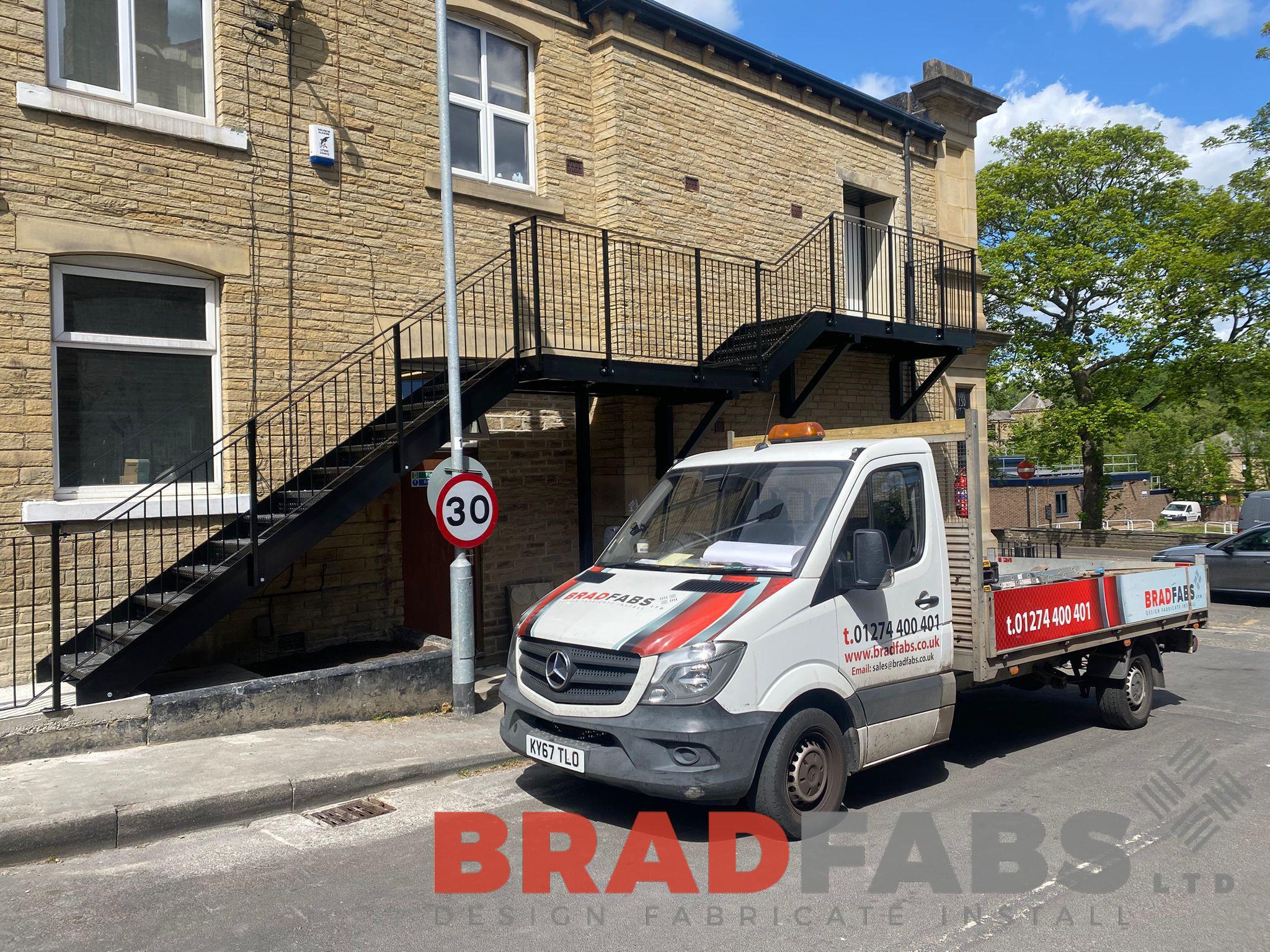 External Emergency Stairwell - Manufactured in mild steel with galvanised and powder coated finish, complete with durbar treads and mid landings and vertical infill bar balustrade