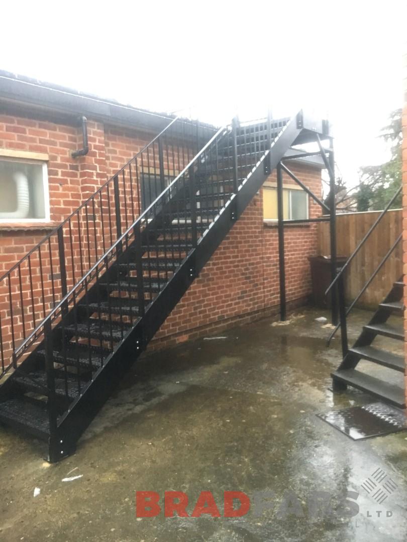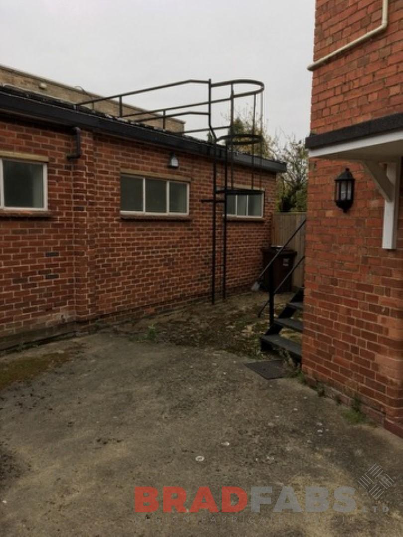 This straight single flight powder coated Fire Escape was designed, manufactured and installed by Bradfabs as a replacement to the existing single floor cat ladder with safety cage.
