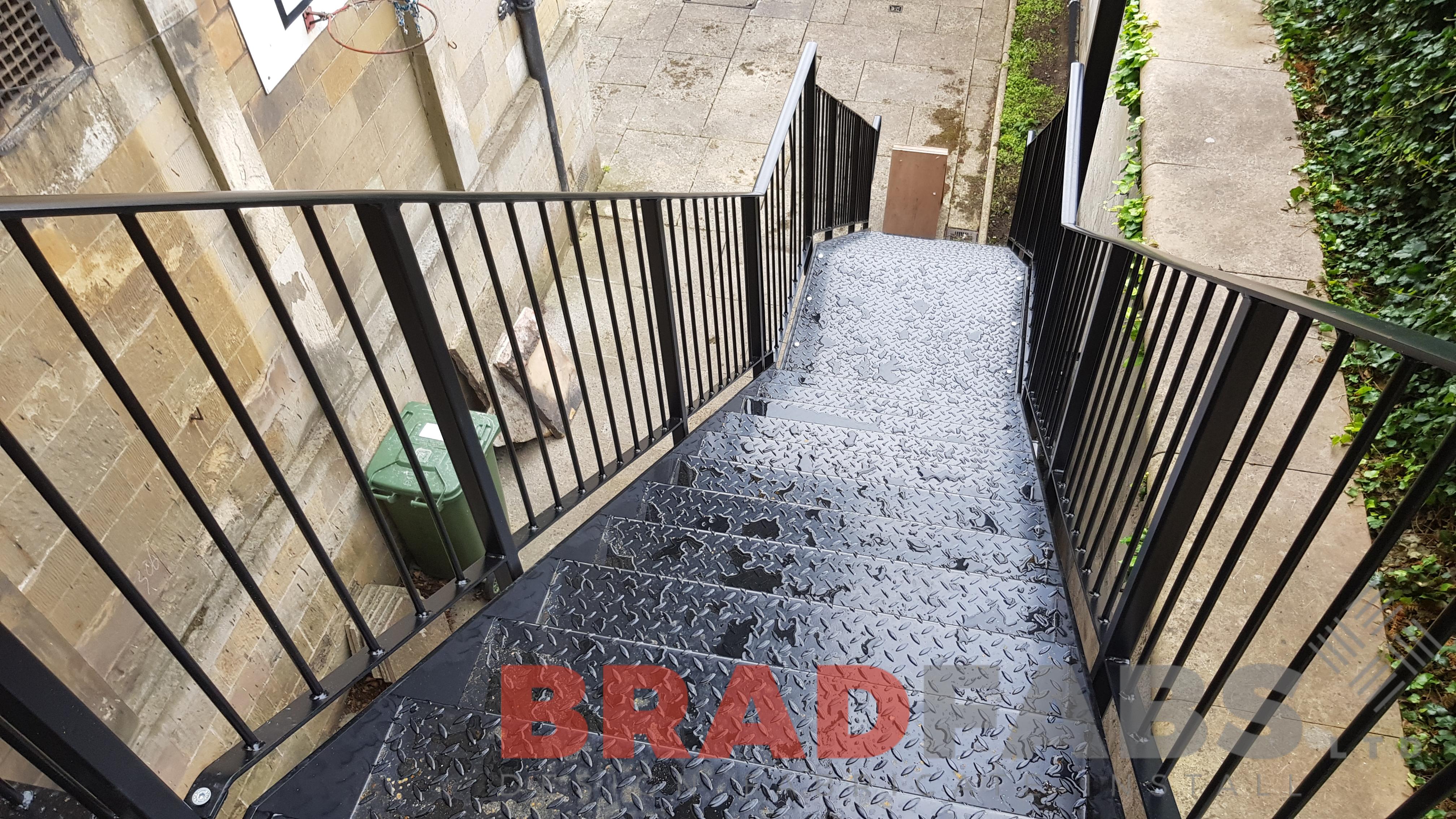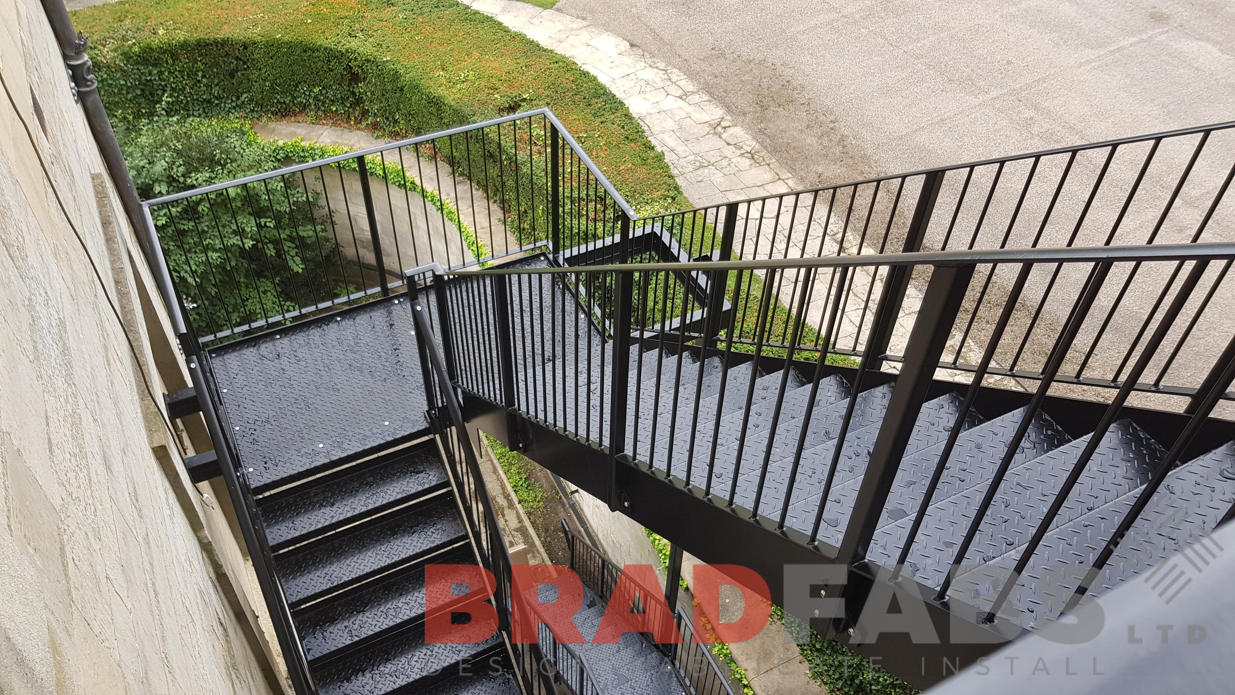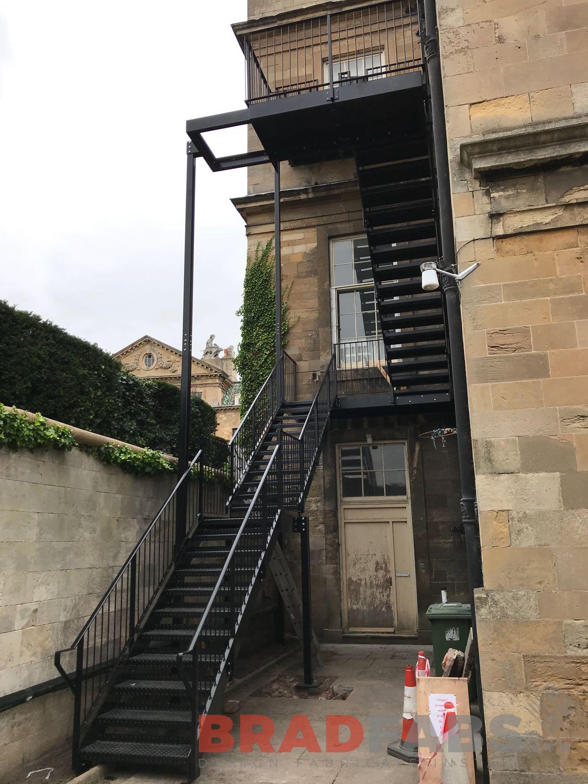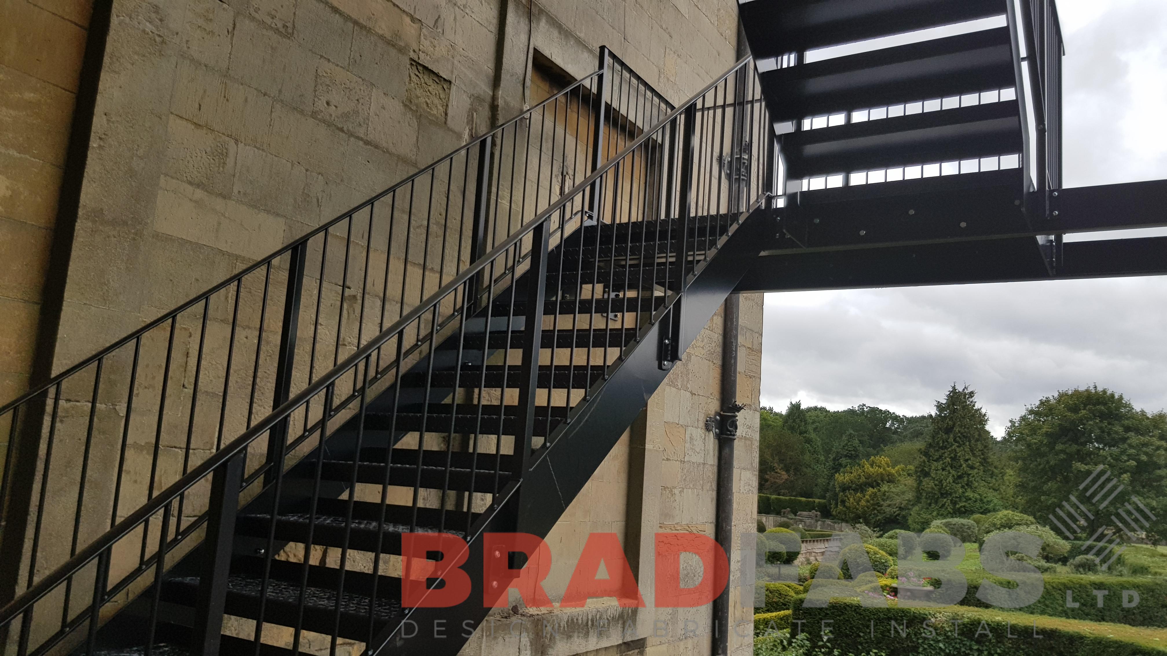 This beautiful stately home required a new access fire escape to add a safety element for their home. Bradfabs have designed, fabricated and then installed this mild steel and galvanised fire escape which was powder coated black. The customer opted for vertical bar balustrade and durbar treads. The fire escape works well for the building and keeps within the tone of the building.