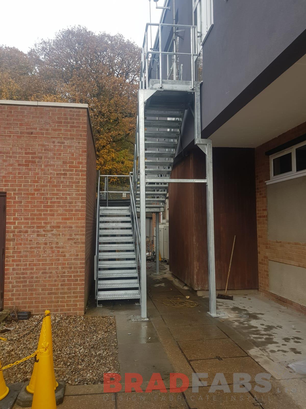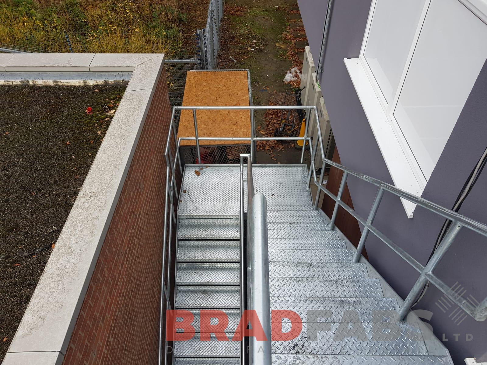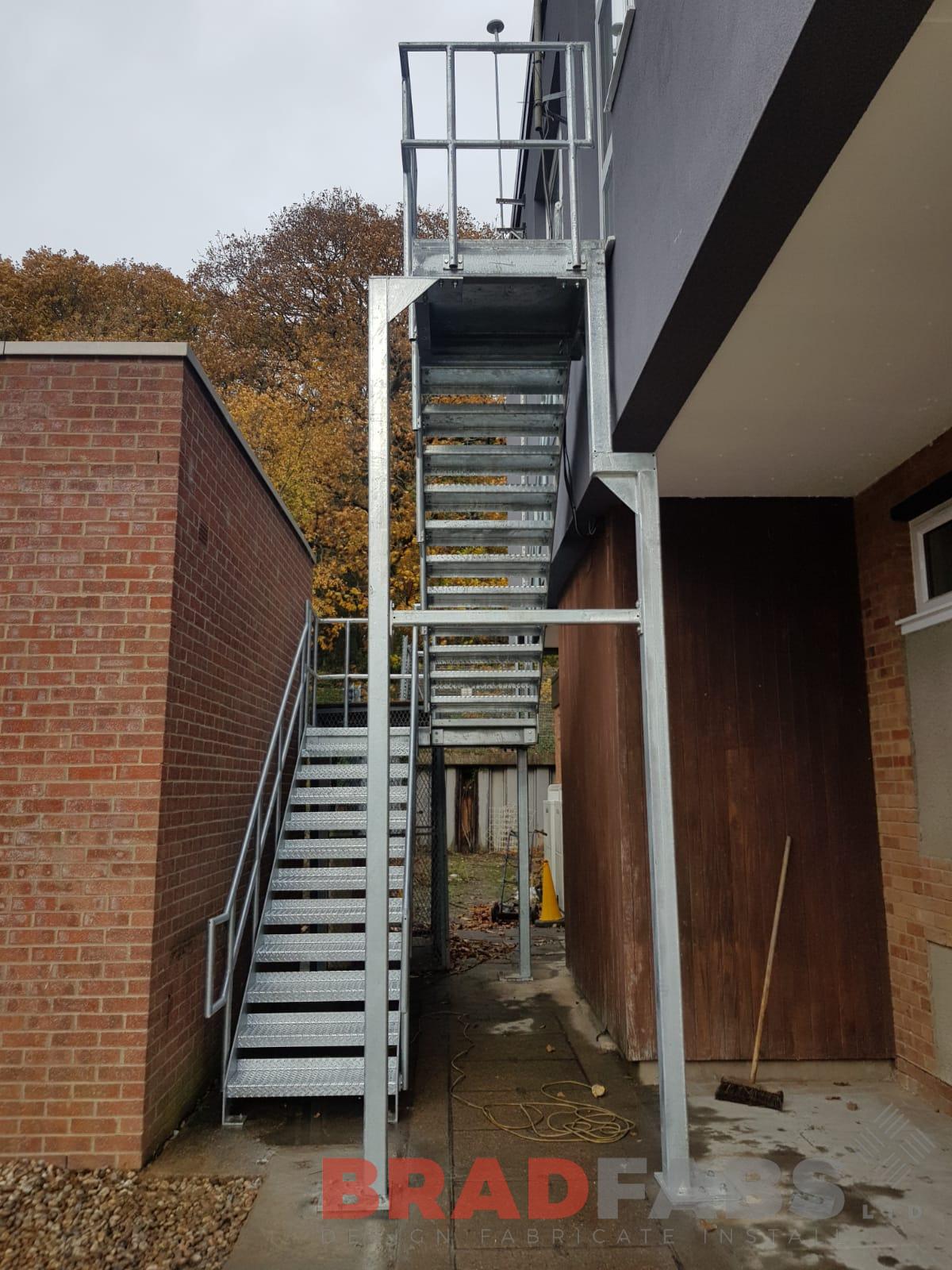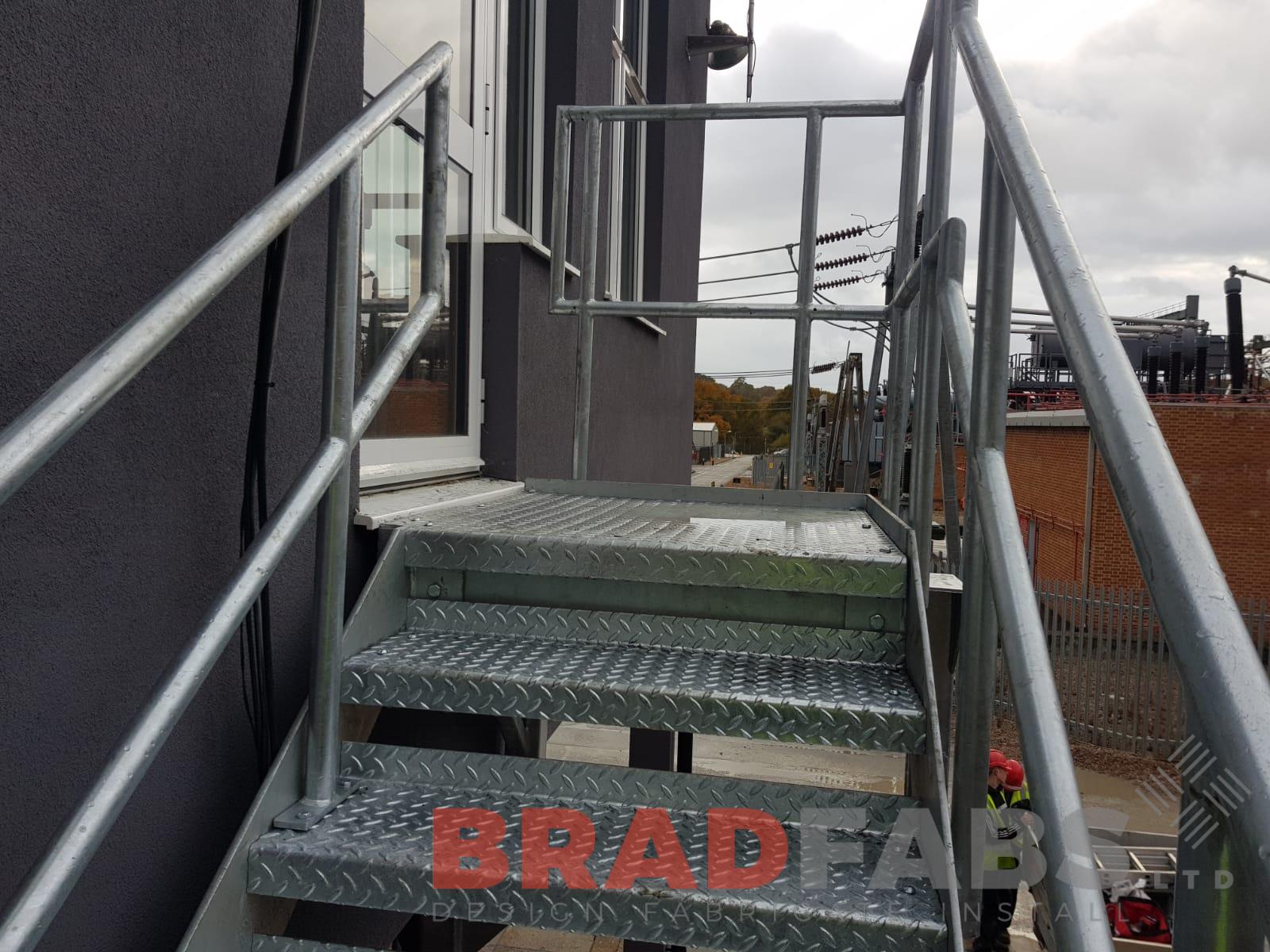 This external Fire Escape Staircase was installed at a substation, the Fire Escape was manufactured in mild steel and galvanised with mid and top rail balustrade and chequer plate treads
