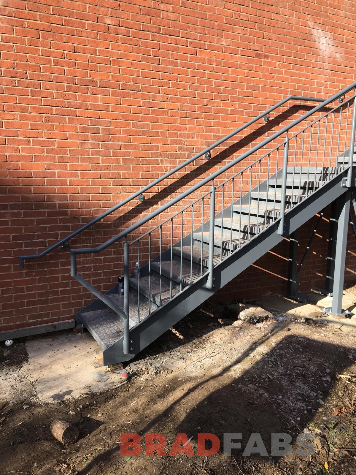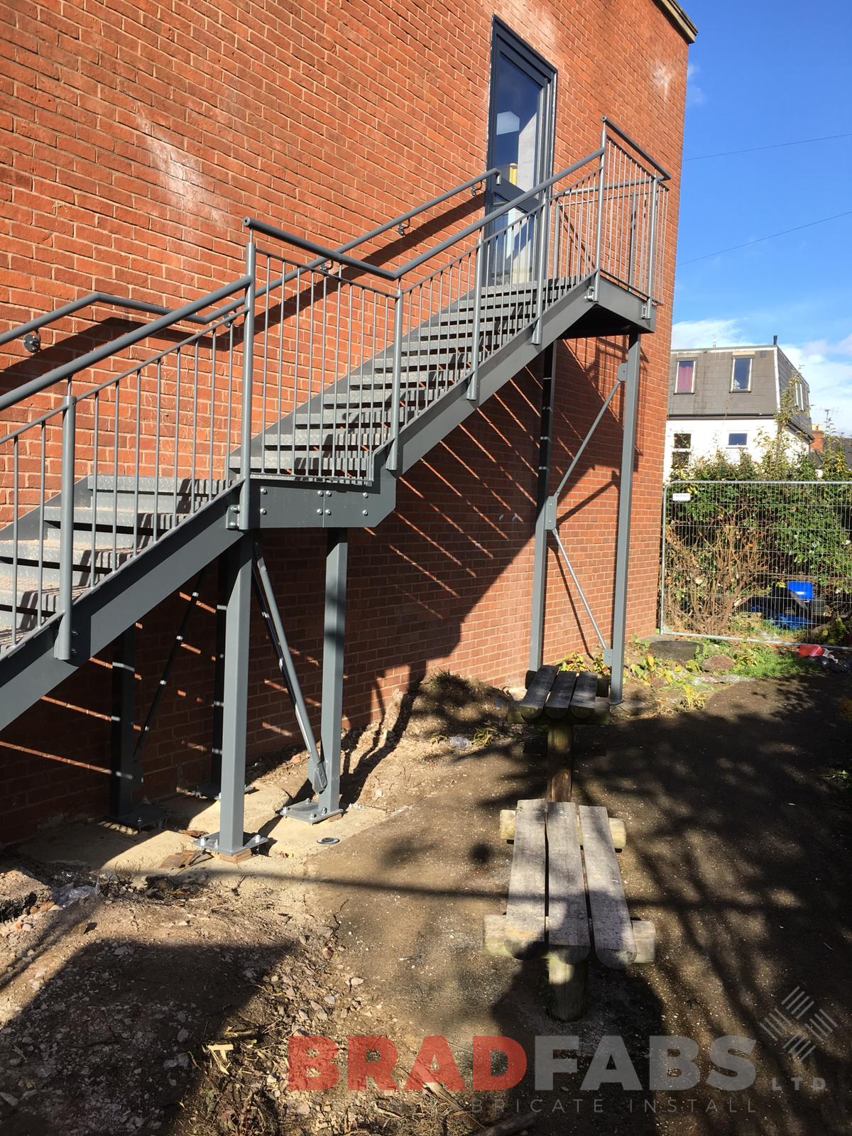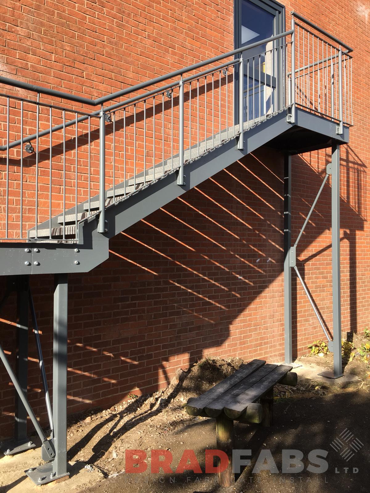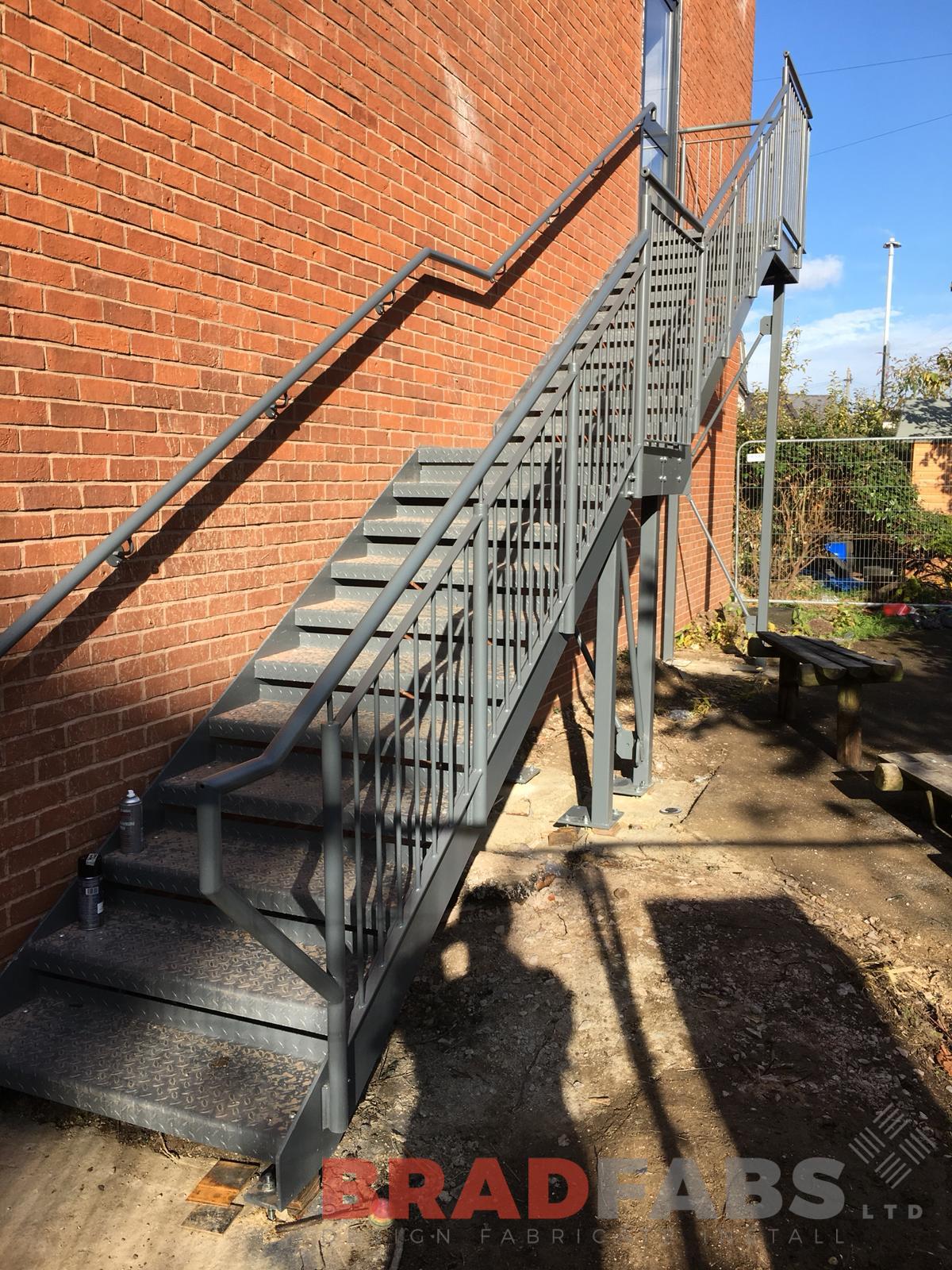 This mild steel, galvanised and powder coated Fire Escape Staircase features vertical bar balustrade with handrail and chequer plate treads. Our installation team installed this at a school in Cheltenham, we designed, fabricated and installed, we offer the complete package.