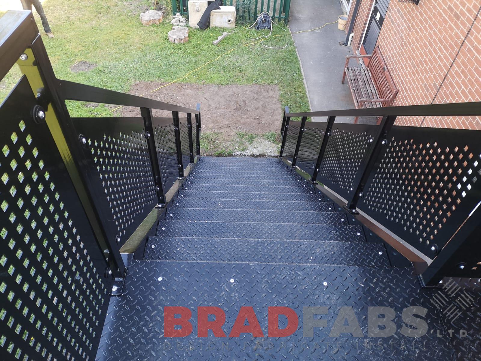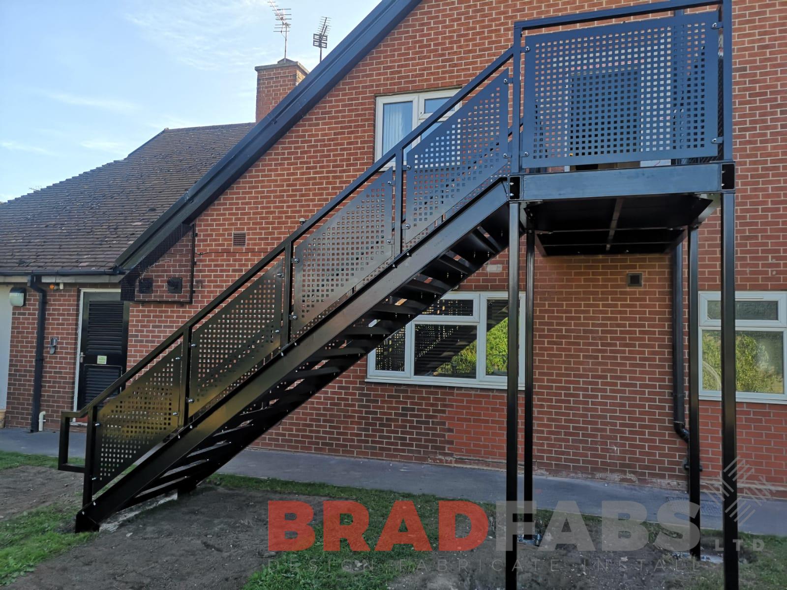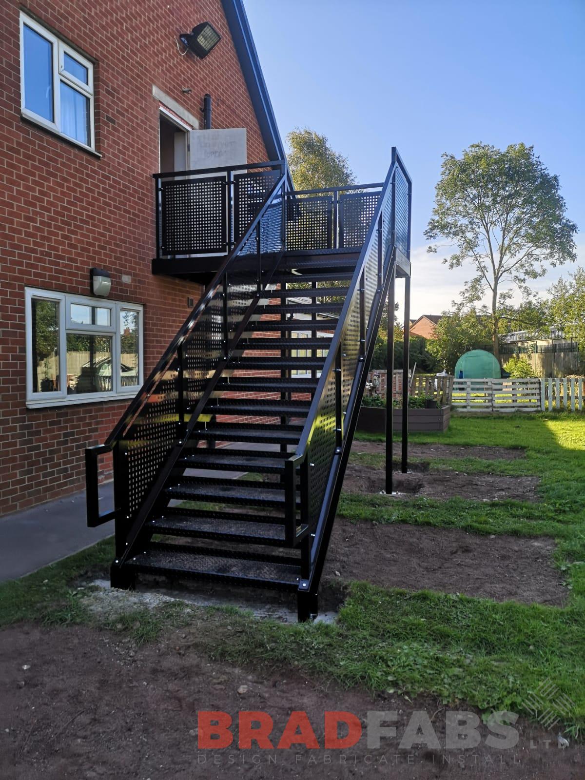 Mild steel, galvanised and powder coated black fire escape with perforated infill panels and complete with durbar treads for a commercial property