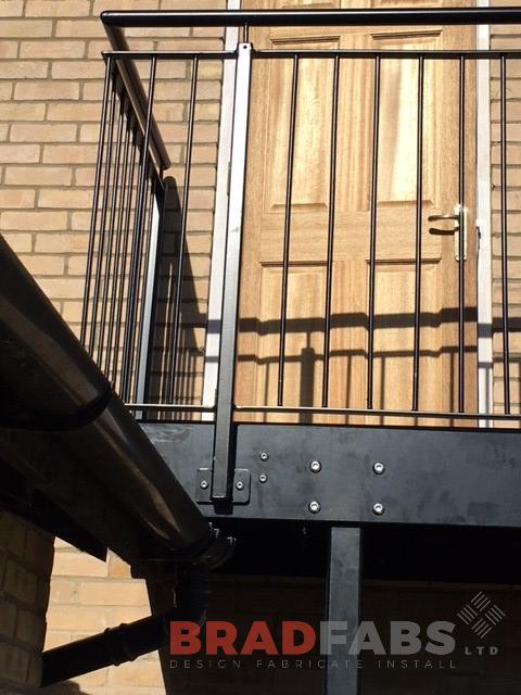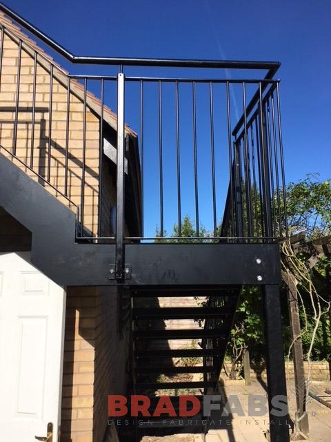 Mild steel, galvanised and powder coated safety exit, with vertical bar balustrade and complete with durbar treads for extra grip under foot