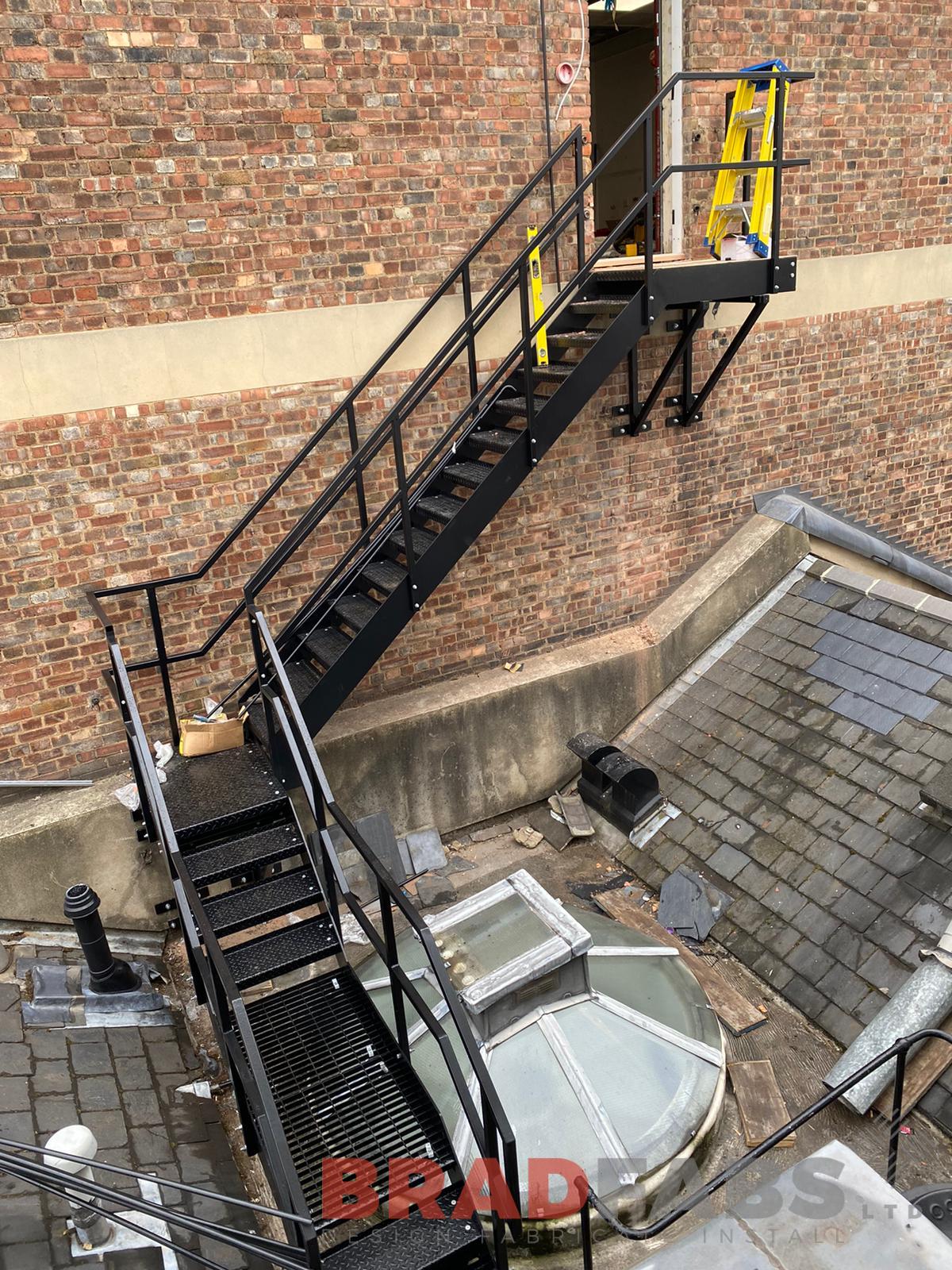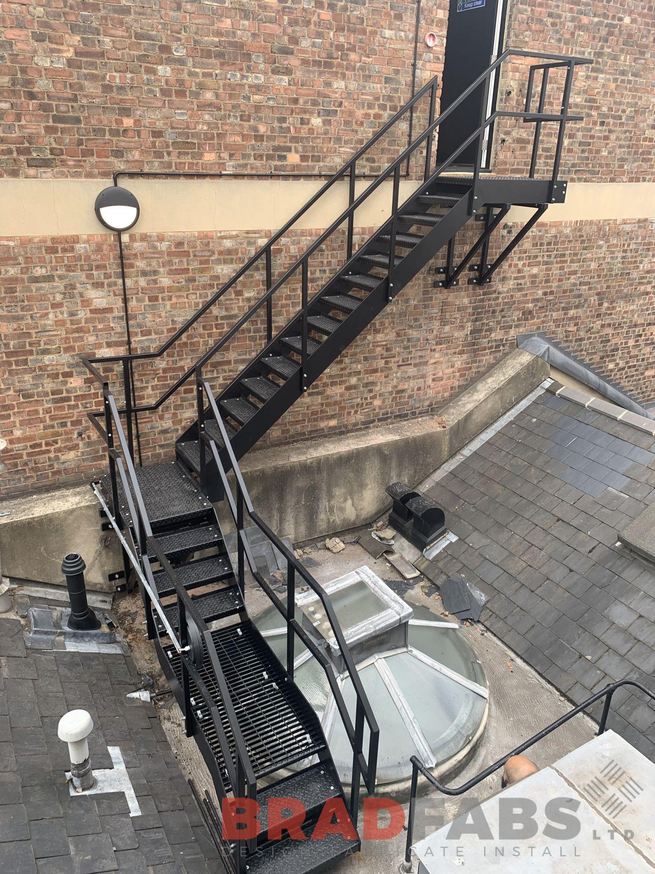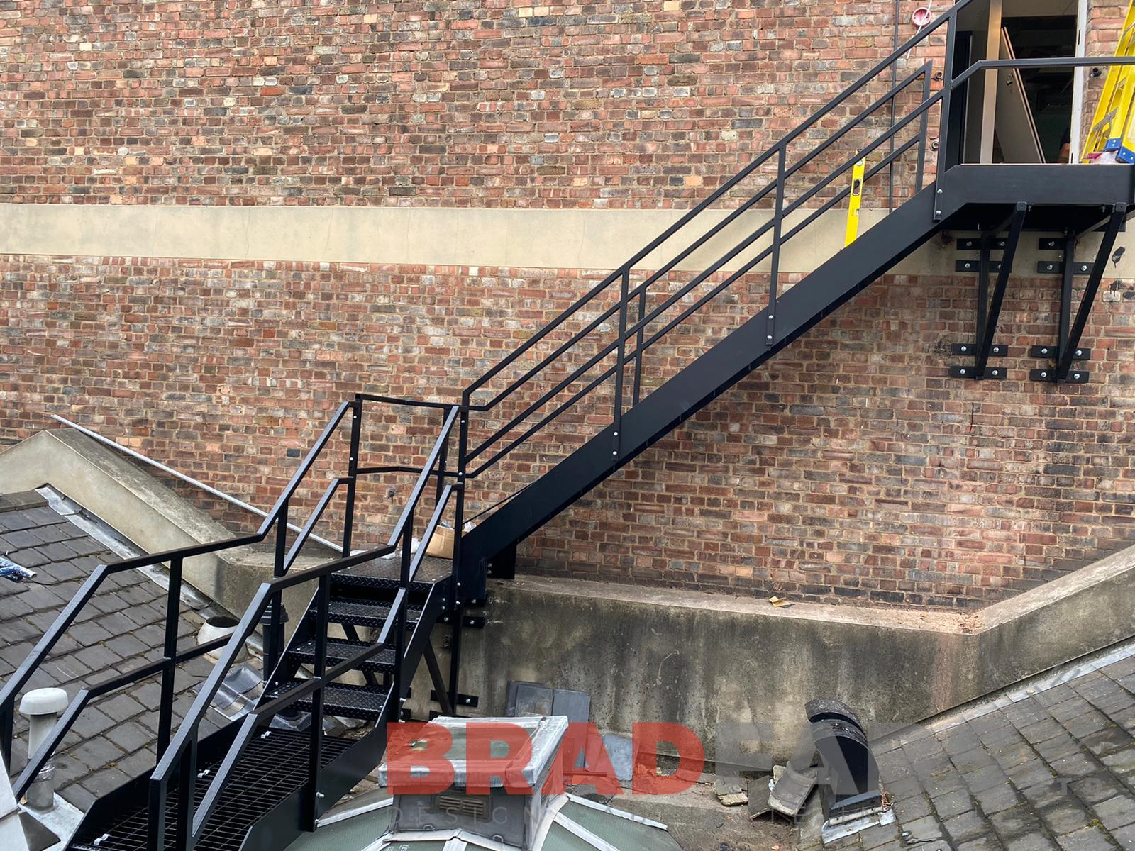 This is the second project we have undertaken for our commercial customer, the nature of this project was for commercial premises in the middle of London up high on a roof top. Bradfabs designed, manufactured and installed the complex staircase in mild steel, galvanised and powder coated with top and mid rail