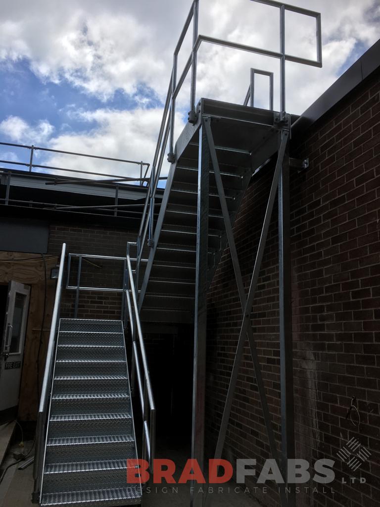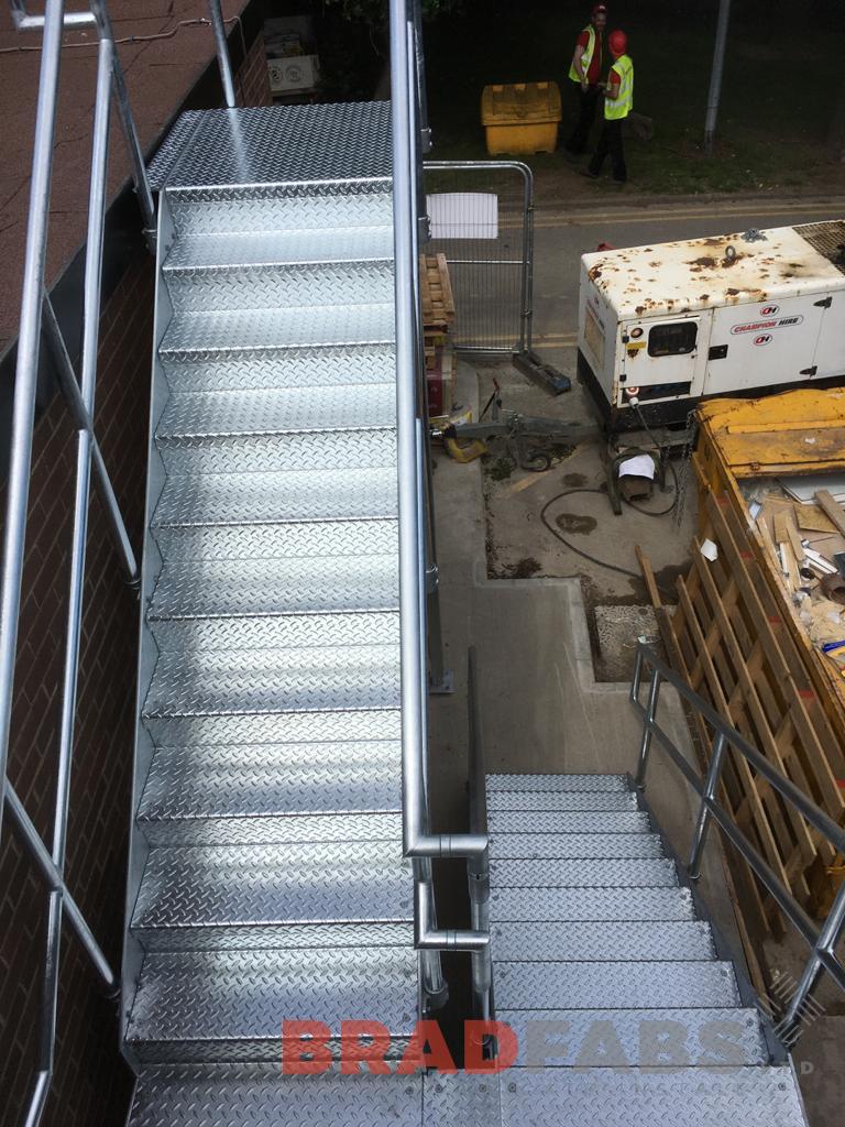 External staircase manufactured in mild steel with a galvanised finish, with mid and top rail balustrade, complete with durbar treads