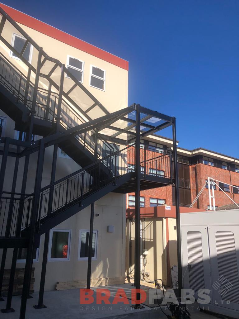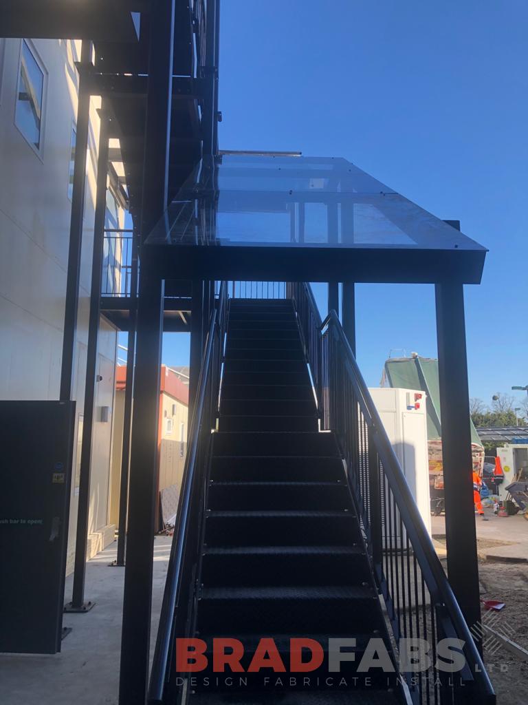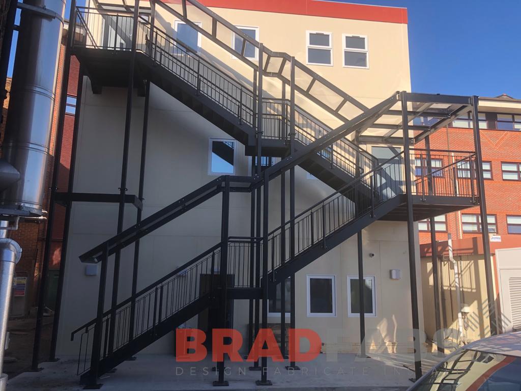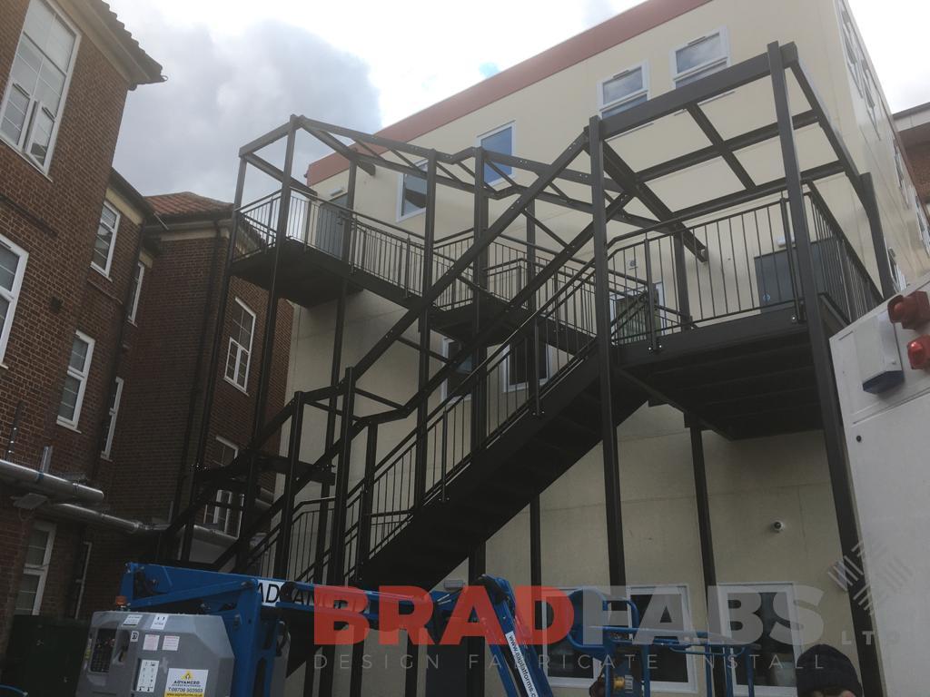 Large bespoke external staircase, with top and mid landing, and vertical bar balustrade