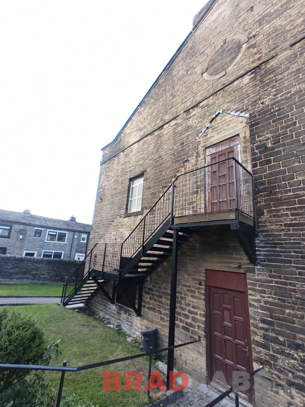 Large straight external staircase with top and mid landing, with vertical bar balustrade and complete with durbar treads.