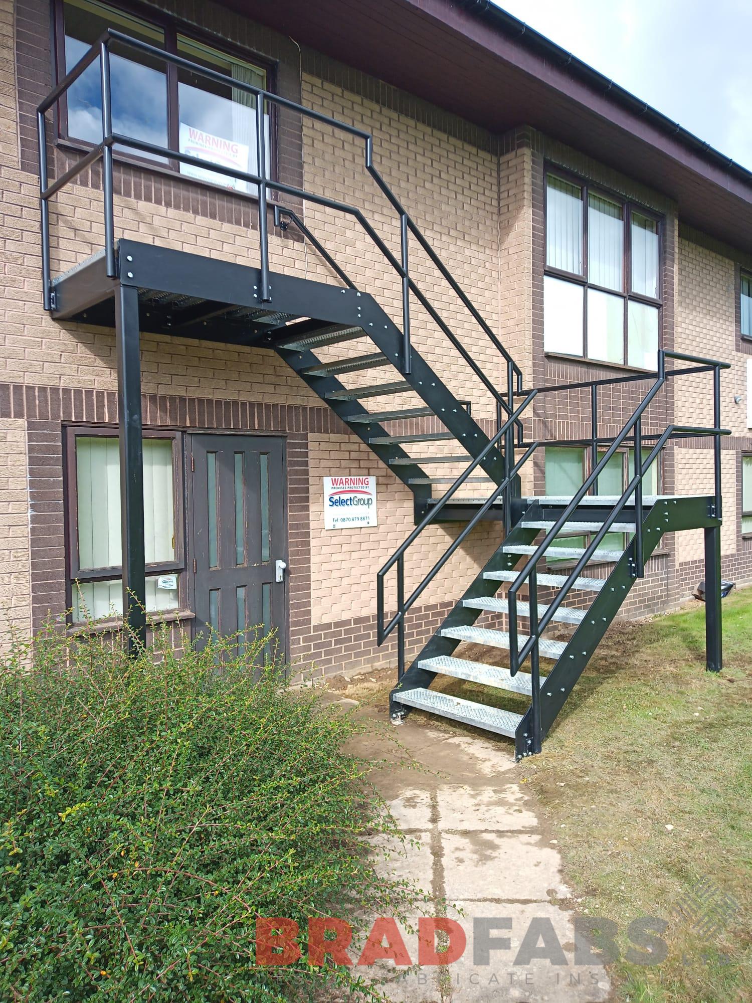 Bespoke external staircase with top and mid landing, top and mid rail balustrade complete with BNOP5 treads and landings