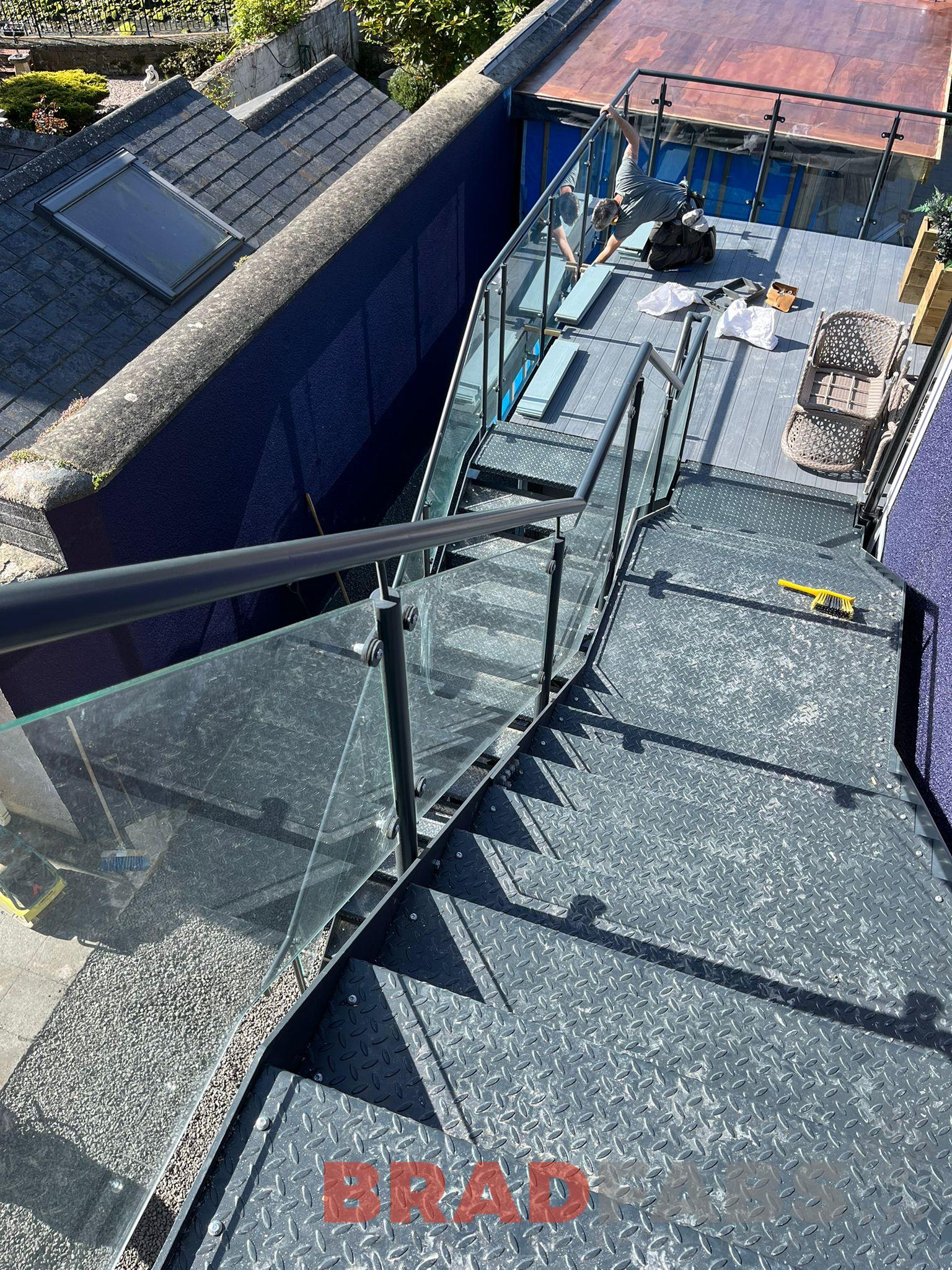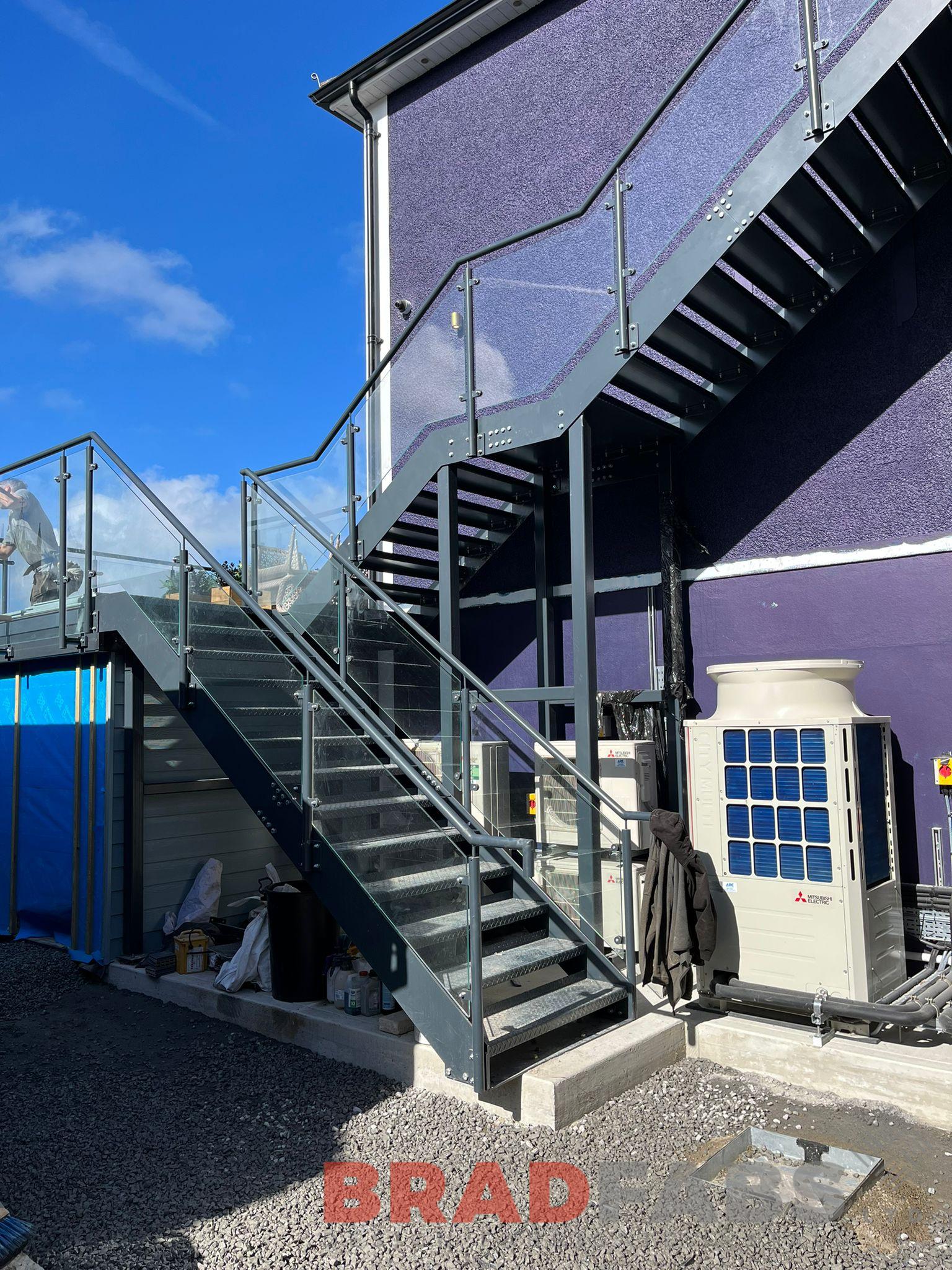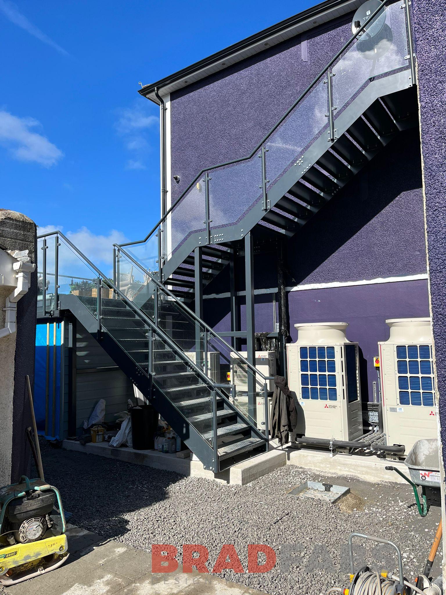 Large external escape access staircase with mild steel, galvanised and powder coated balustrade with glass infill panels complete with durbar treads