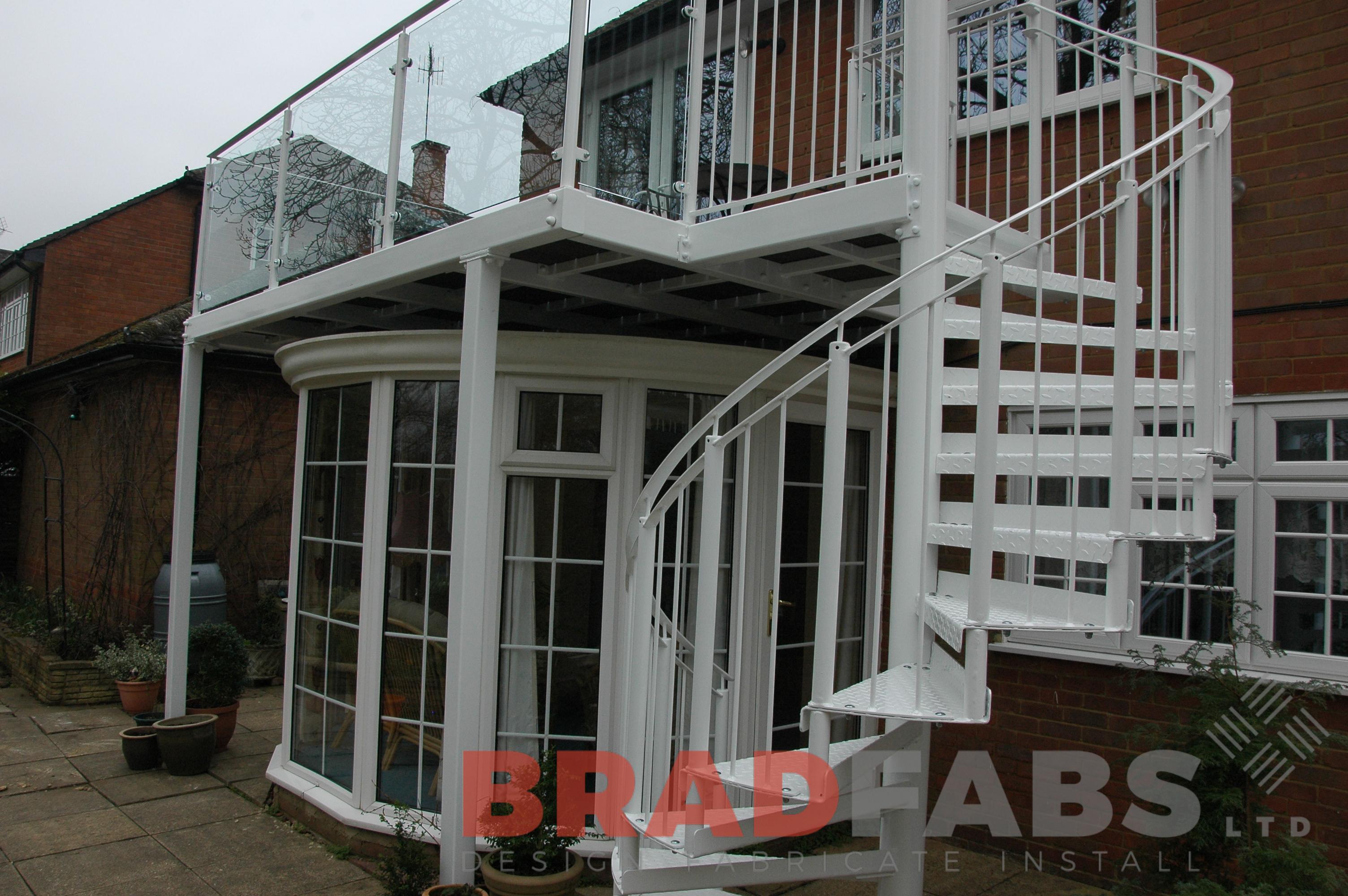 This toughened glass balcony provides a seating area from these first floor french doors. It is fabricated and a galvanized in mild steel and powder coated white to colour match the buildings window frames and curved conservatory. It's installed at a home in High Wycombe, Buckinghamshire, UK.