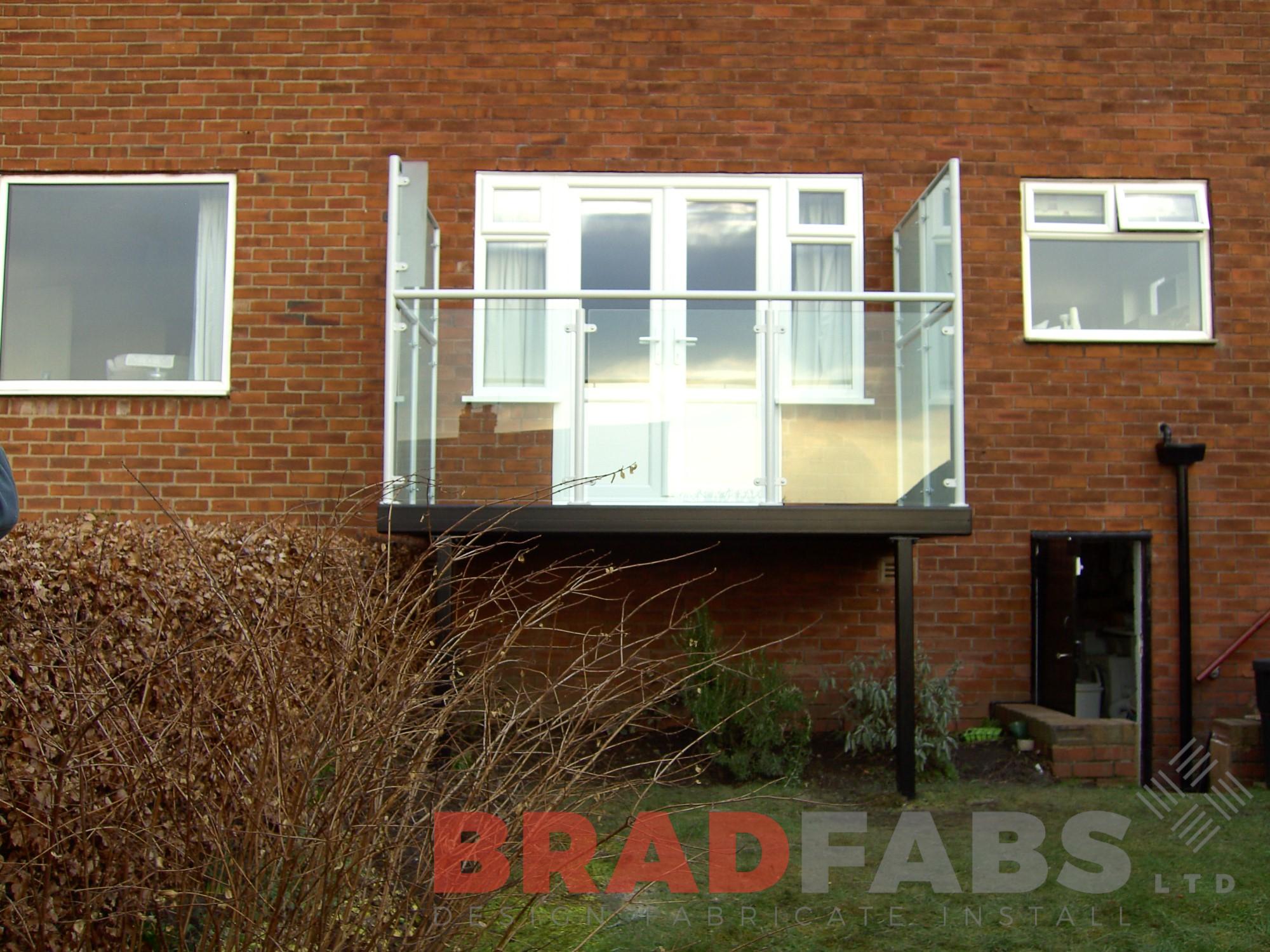 This mild steel and glass balcony provides a ground floor dining room seating area; ideal for warm spring and summer days! It features clear and frosted glass for great viewing and privacy. This project also included supplying UPVC windows and insulated doors to Brighouse, Leeds.