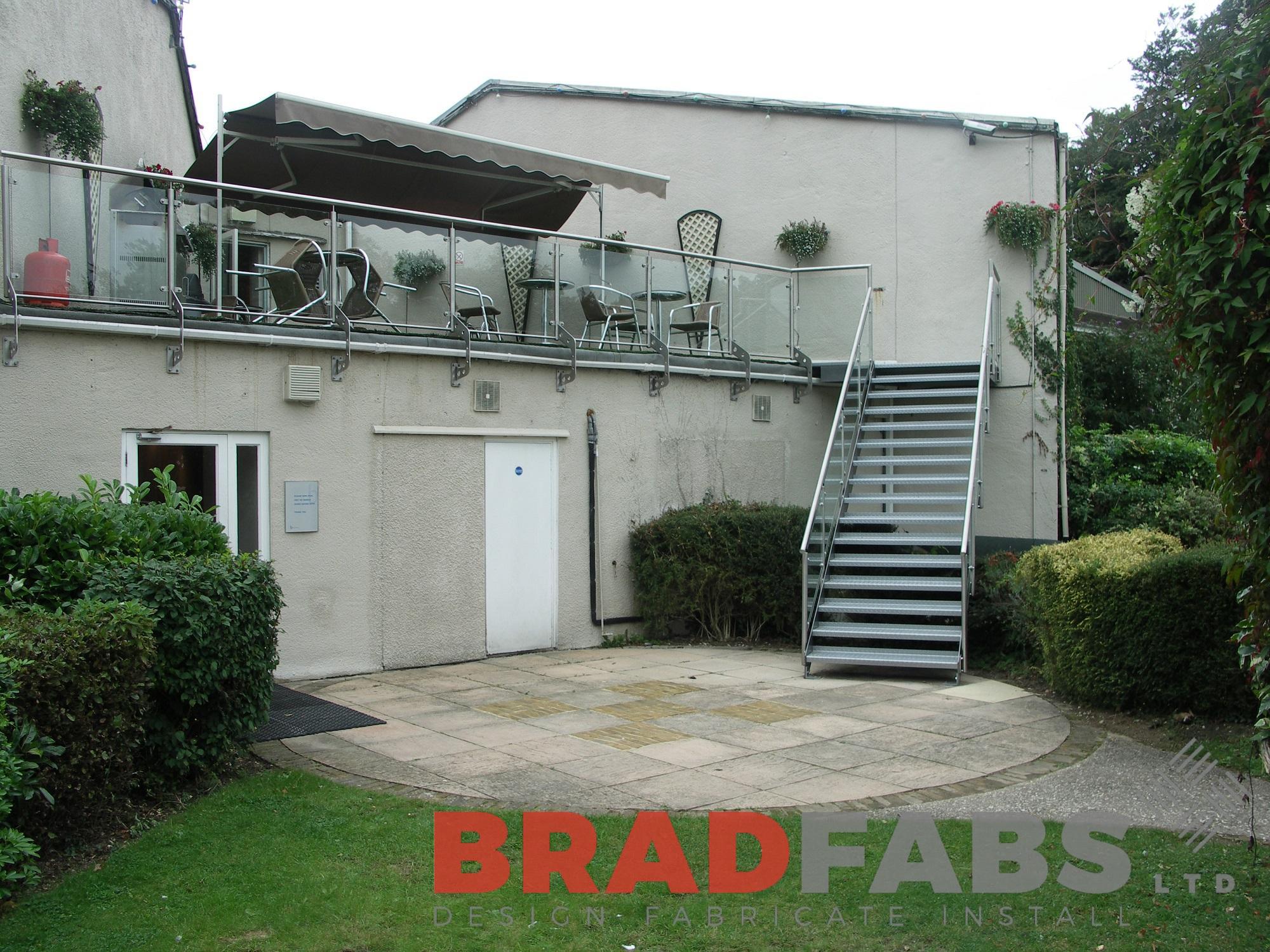 This brushed stainless steel straight staircase with matching balustrading, staircase stringers and glass infill panels. It is designed with an additional new landing area and is installed at Tennis Club, London.