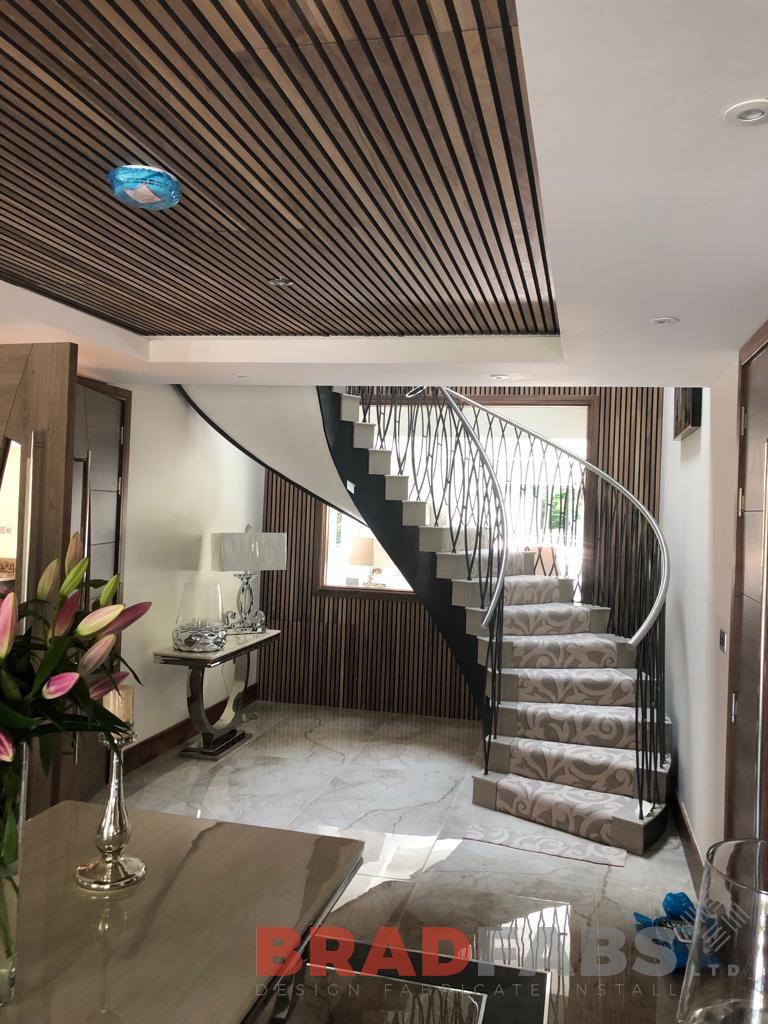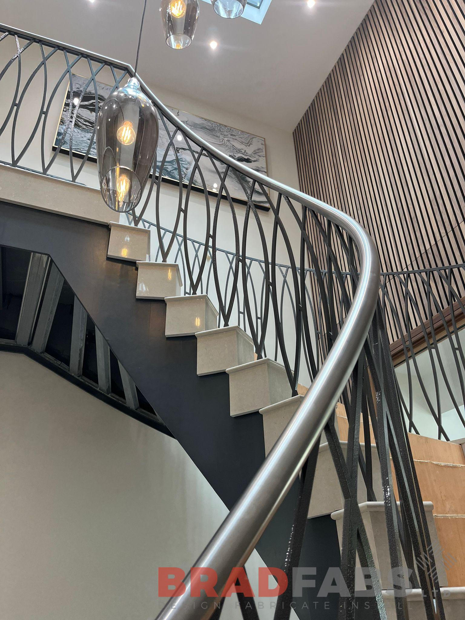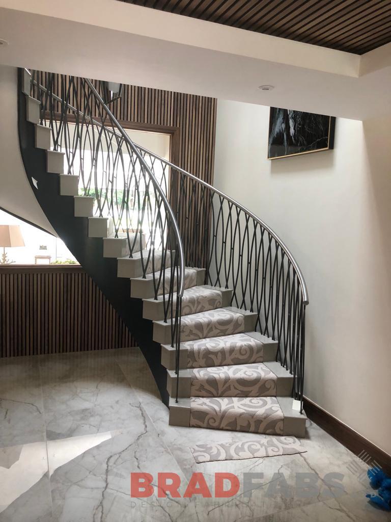 Internal helical stair with decorative balustrade and steel treads, clad with marble and a carpet finish