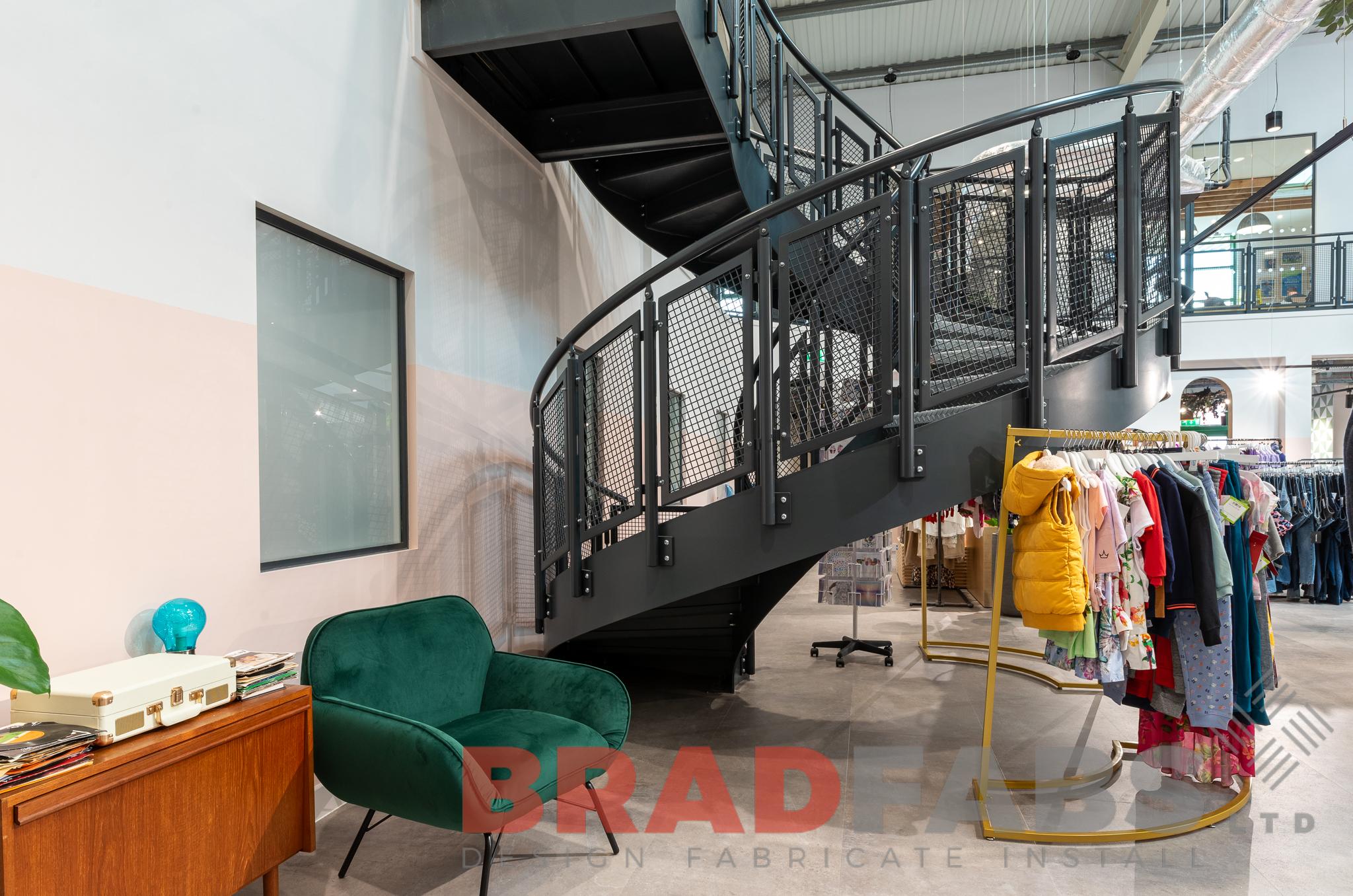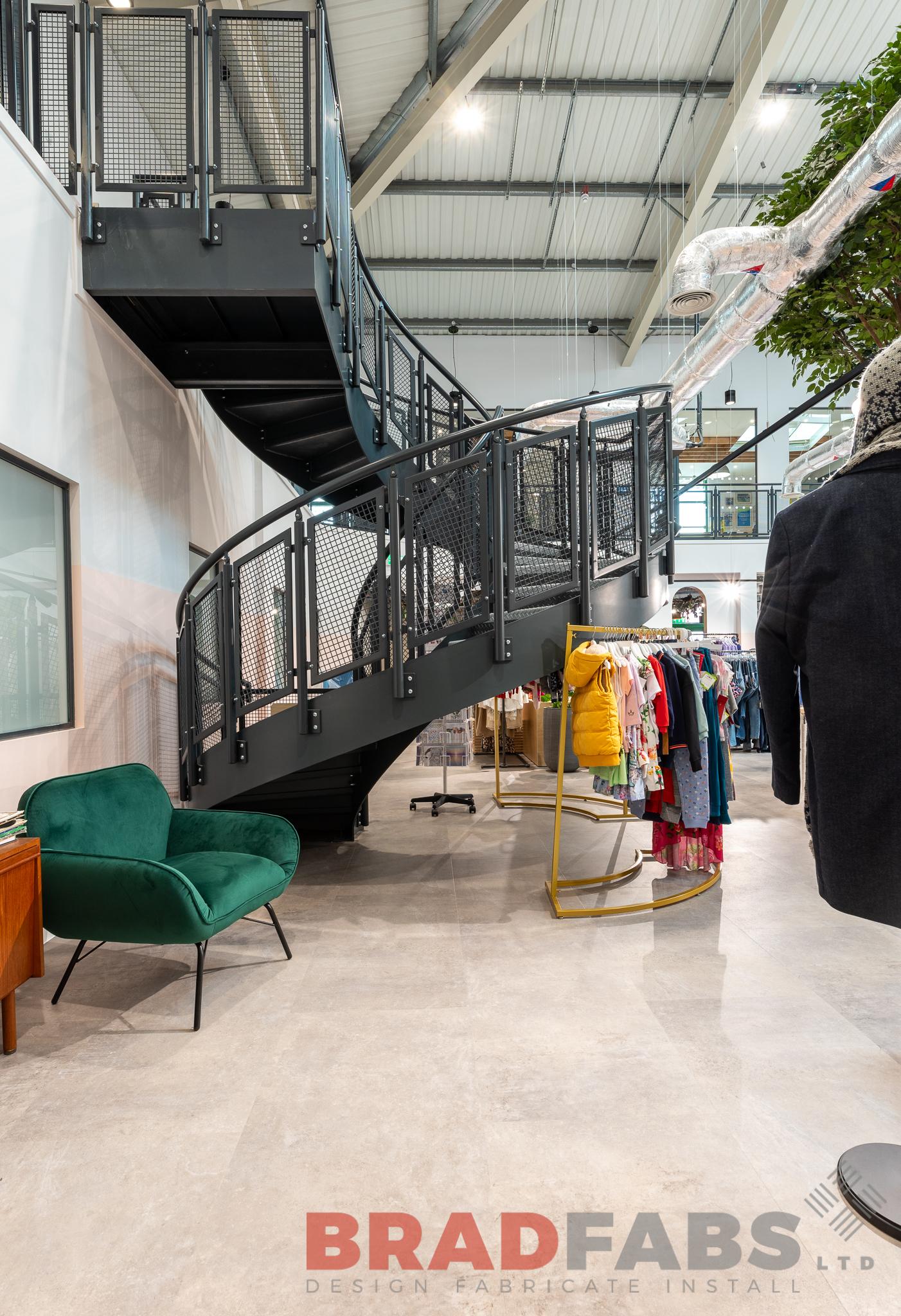 Internal helical stair with mesh infill panel balustrade and durbar treads for a commercial property
