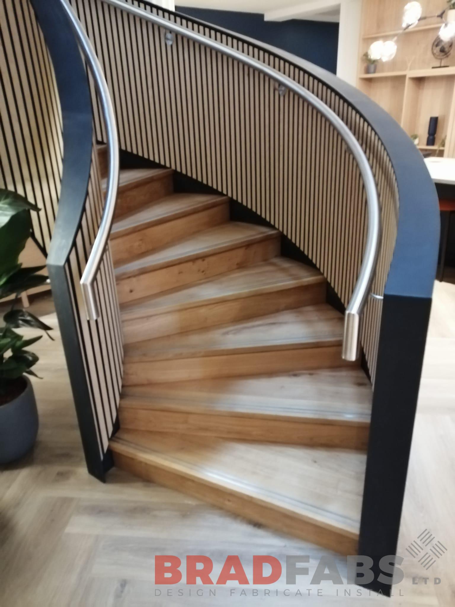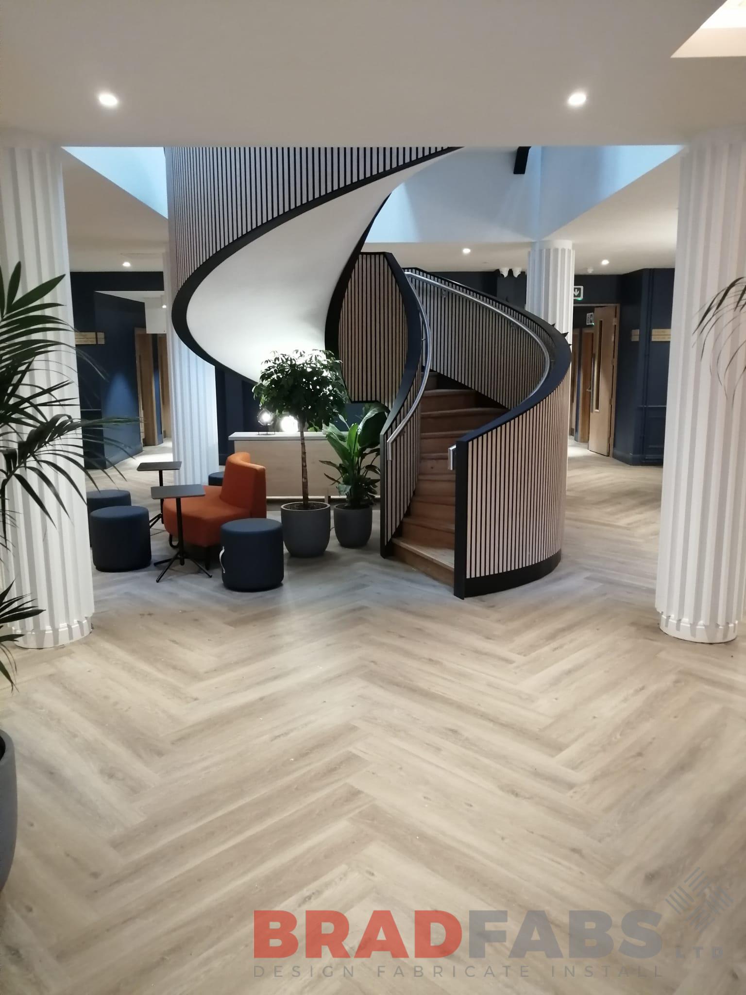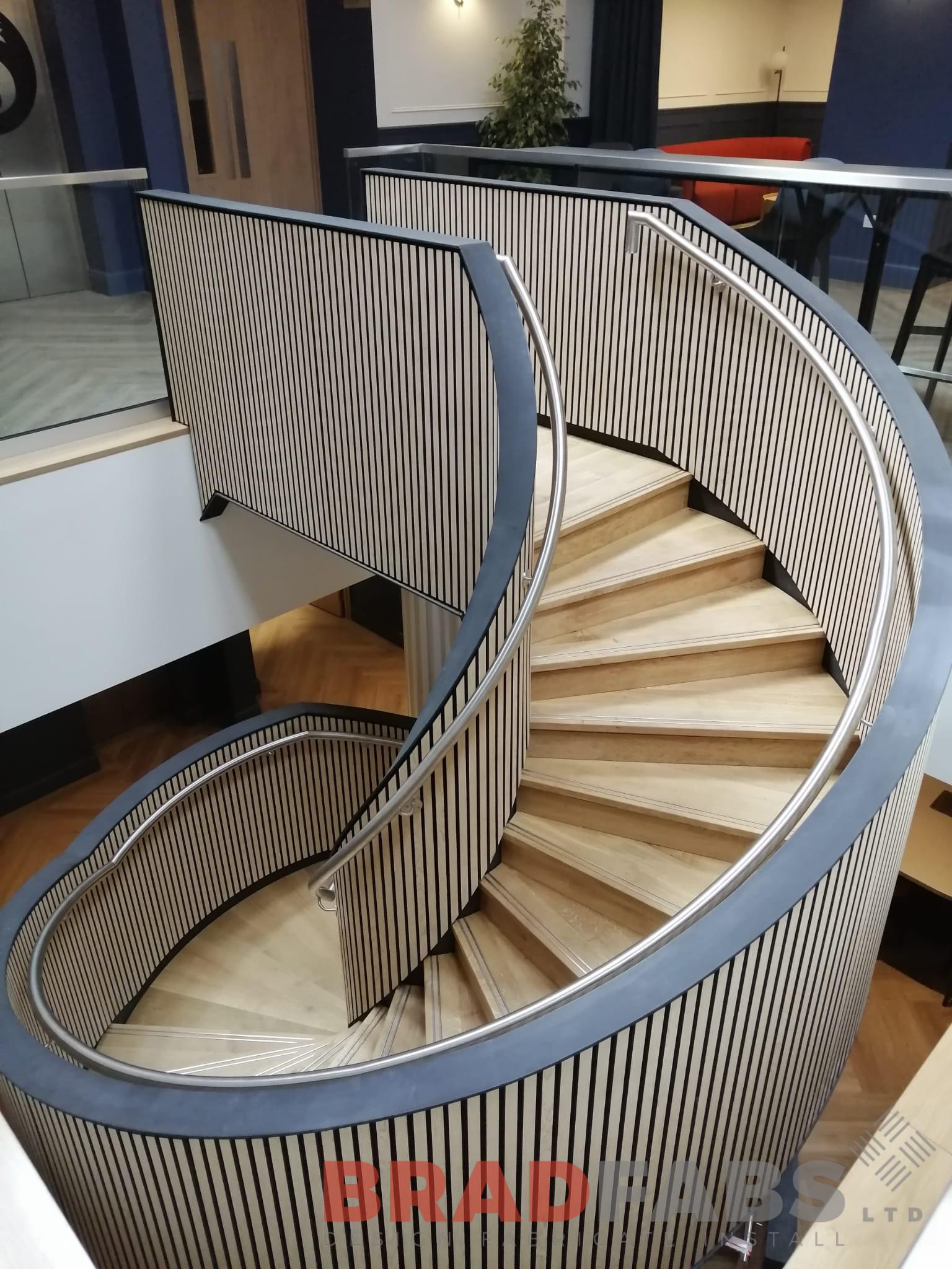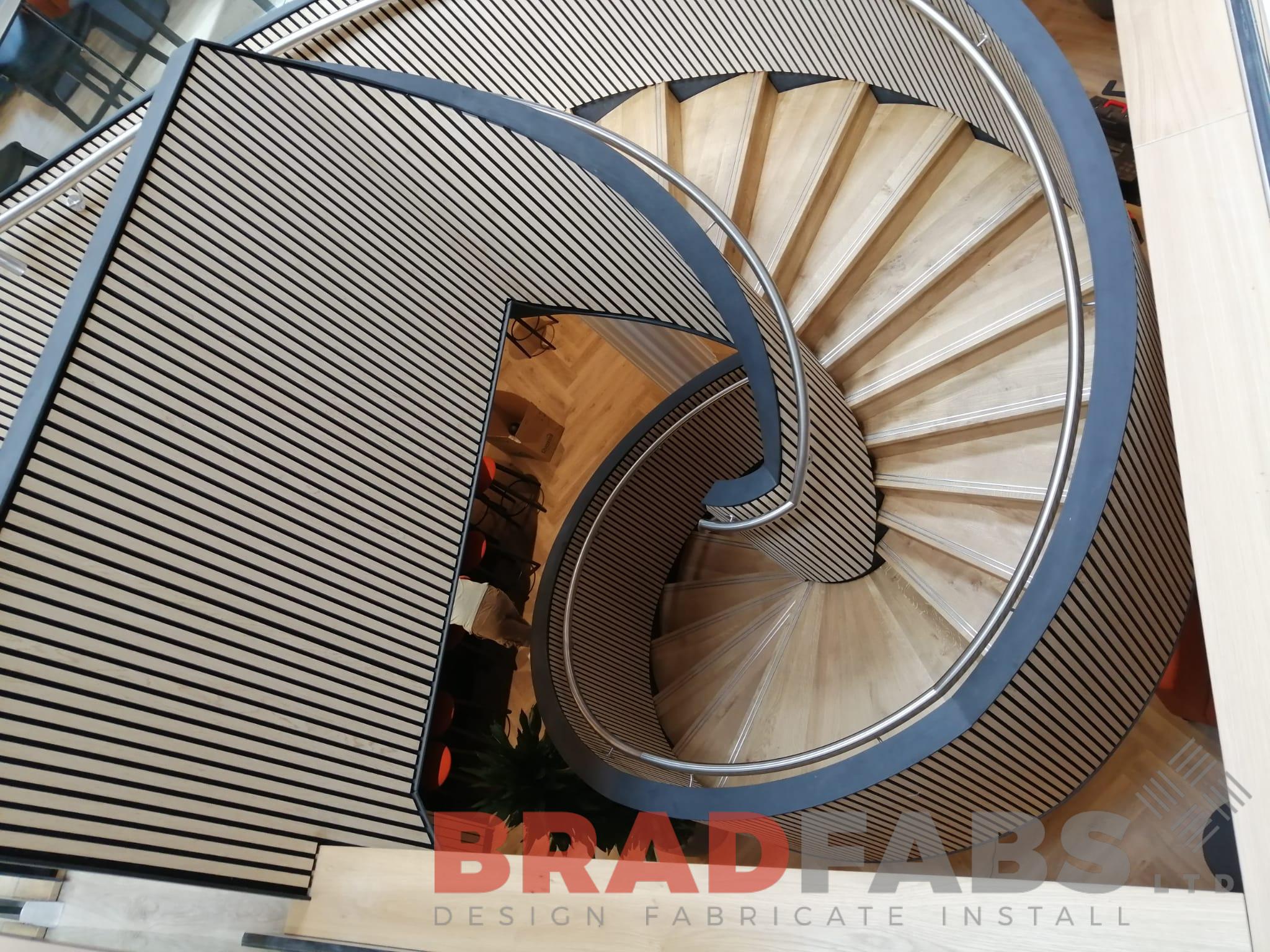Bespoke internal helix staircase for a commercial property. Designed, supplied and installed by Bradfabs