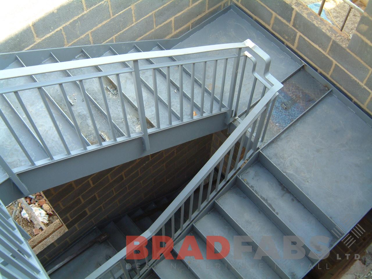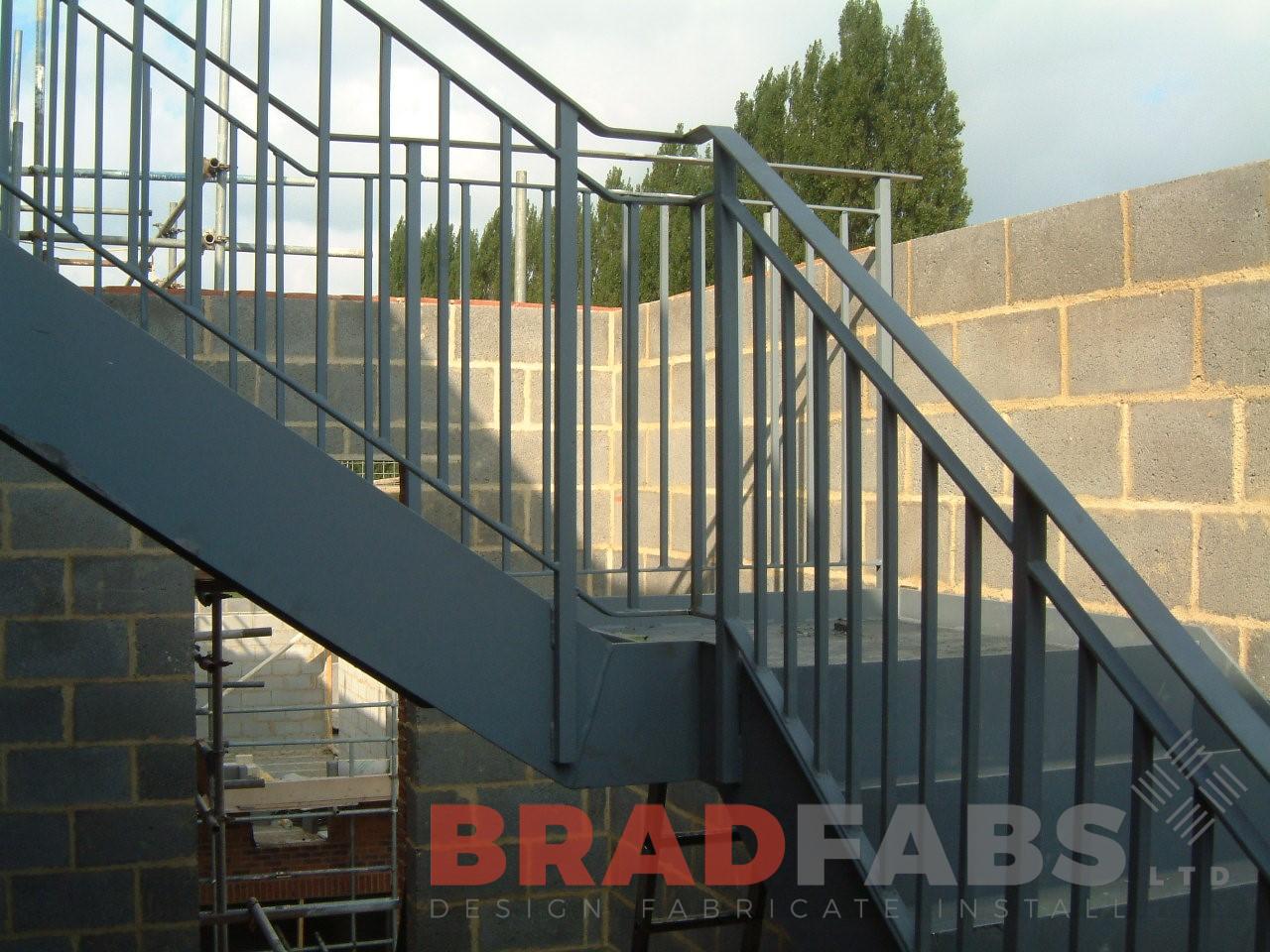 This fire escape has tread wells which are to be filled with concrete, to complete the fire escape stairs. It has been fabricated using mild steel, then galvanized, painted and installed in York, West Yorkshire