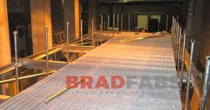 This industrial steel walkway is elevated, wall and ground mounted and includes handrails. The walkway is fabricated in mild steel and galvanized to resist the pending footfall and external weather conditions.