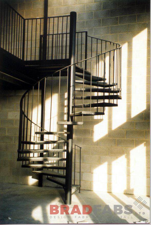 This spiral fire escape has been designed and manufactured with an additional guard rail for the upper level of the building. It is fabricated in mild steel, galvanized, painted black and this example is installed at SHCIA in West Yorkshire.