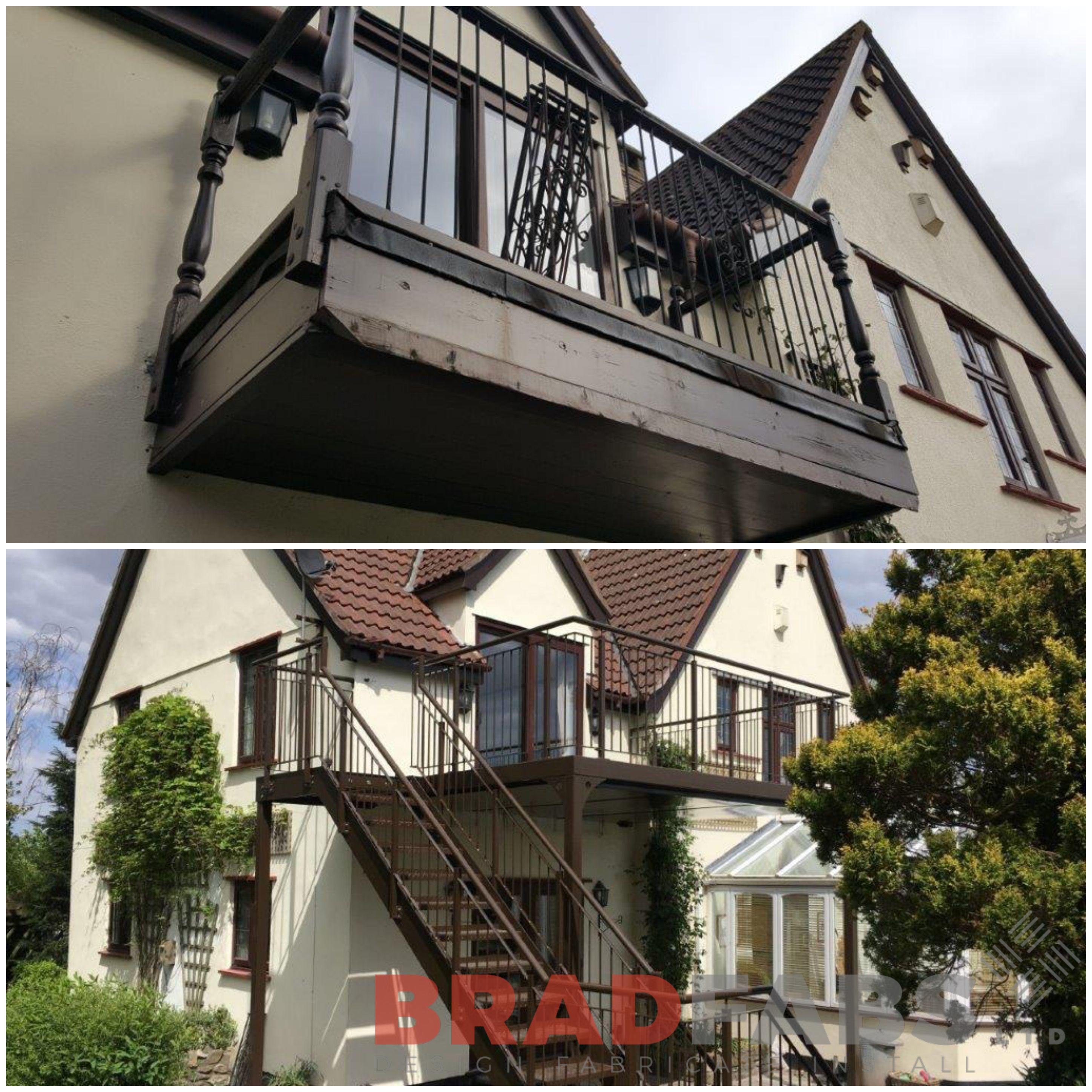 The customer requested vertical bar balustrading on the balcony which matched perfectly with the balustrading on the garden access staircase, all manufactured in mild steel, galvanised and powder coated to a colour of the customers choice.