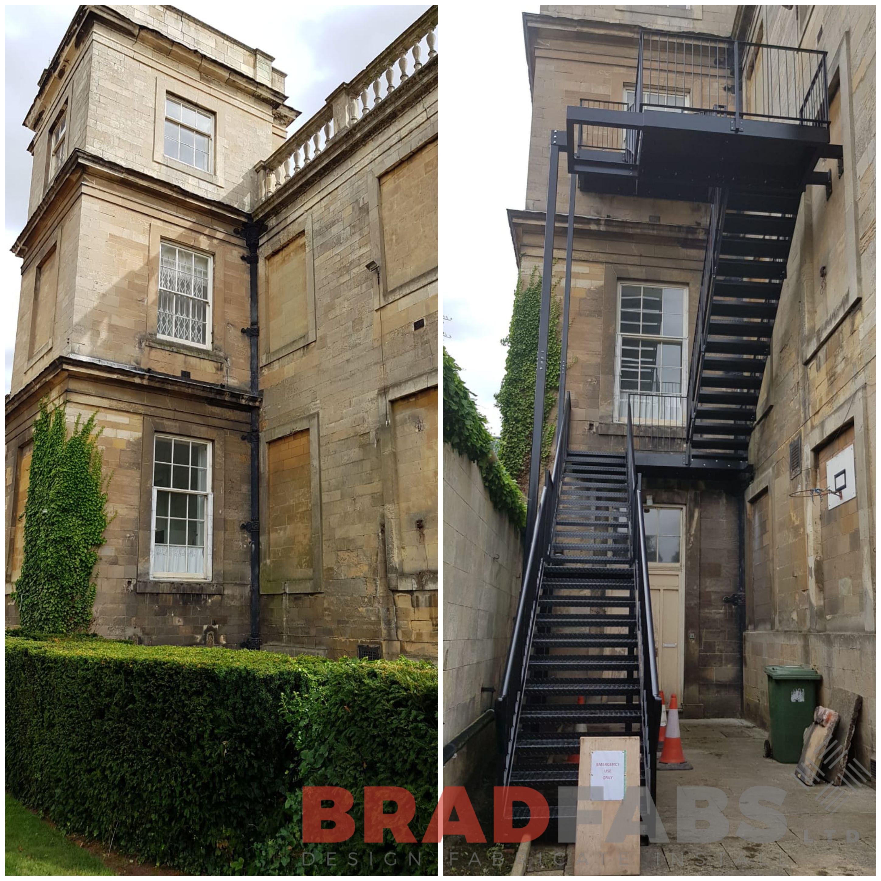 This beautiful stately home required a new access fire escape to add a safety element for their home. Bradfabs have designed, fabricated and then installed this mild steel and galvanised fire escape which was powder coated black. The customer opted for vertical bar balustrade and durbar treads. The fire escape works well for the building and keeps within the tone of the building.
