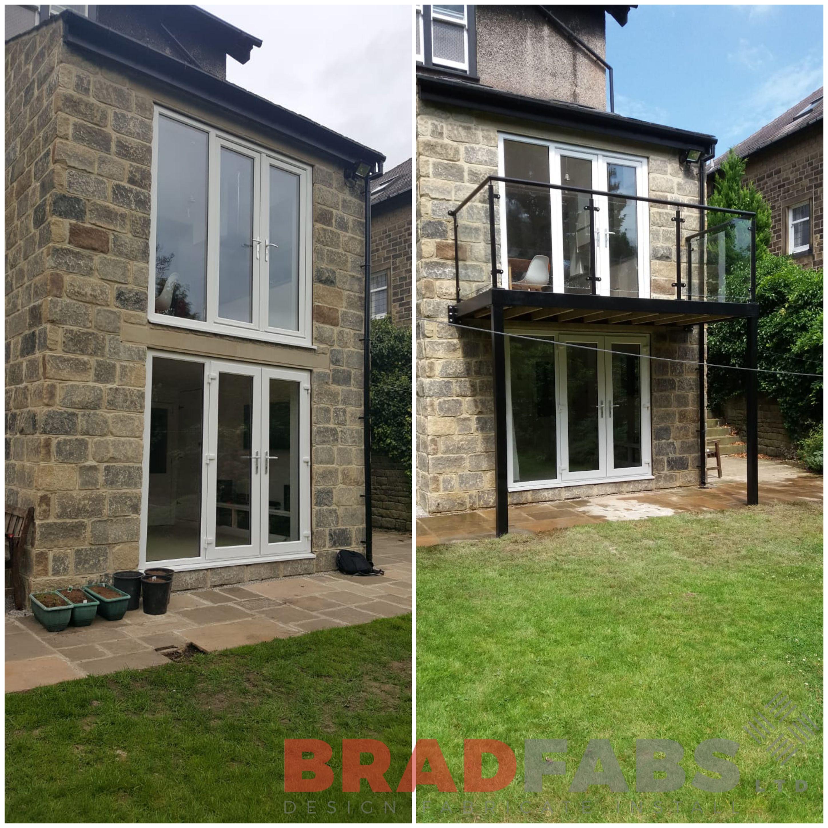 This customer opted for a balcony is powder coated in contrasting colour to the windows and doors. This raised balcony provides a seating area from the second floor french doors and is fabricated in galvanized mild steel. It features toughened glass infil panels