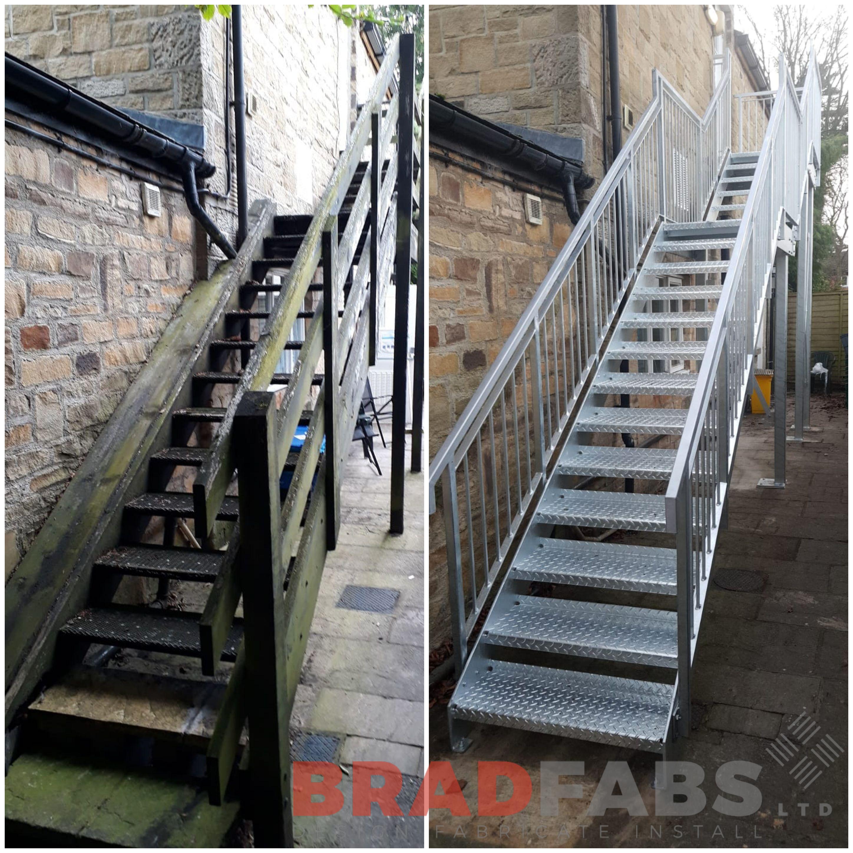 Professionally installed fire escape. This fire escape is in mild steel and has been galvanised to protect against all weather conditions. We have previously worked with this customer before on another site for them, this time we were employed to replace an existing rotten wooden fire escape
