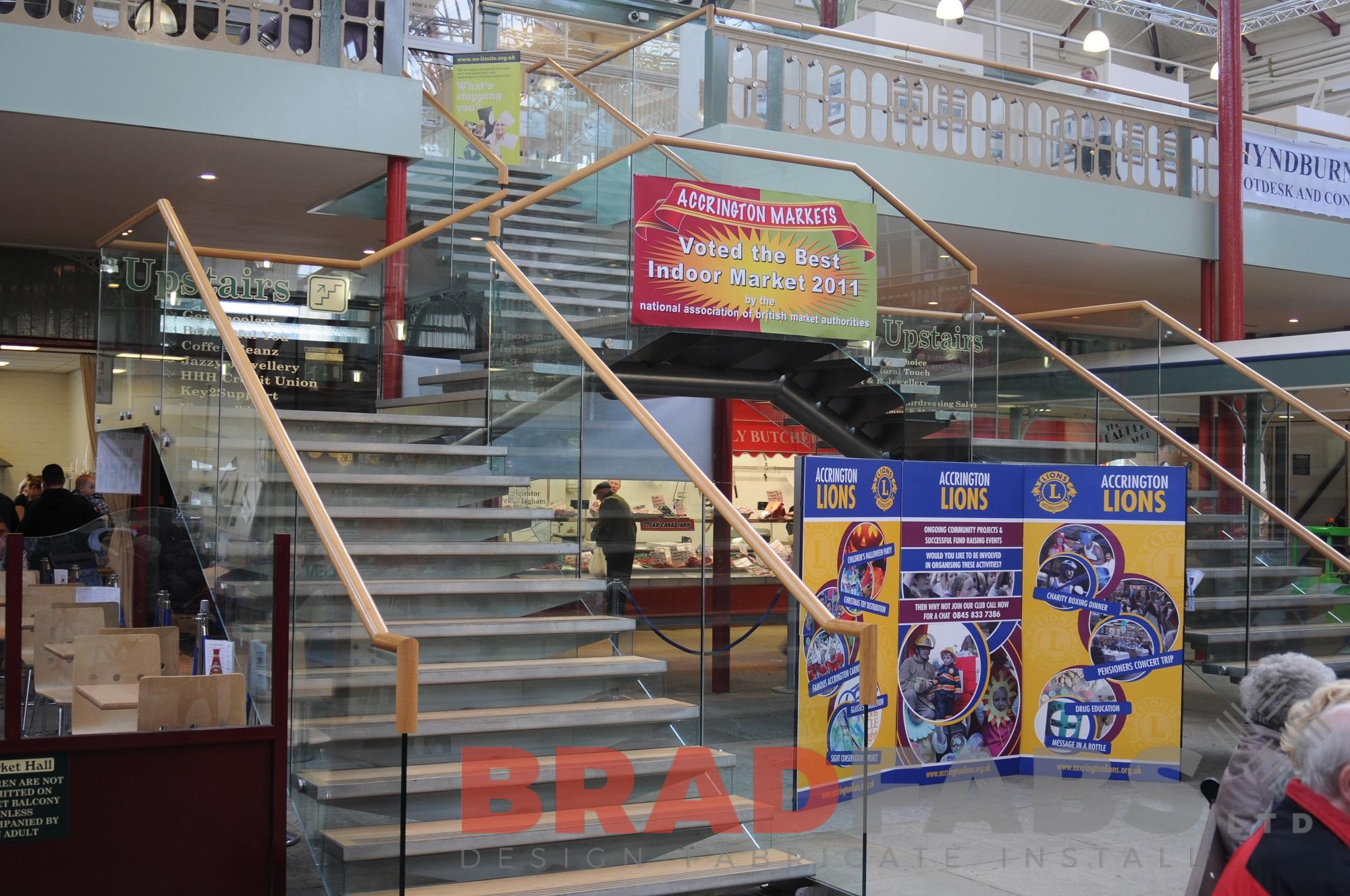 This three tiered straight staircase is fabricated in mild steel and features a large but subtle mild steel supporting spine. It also has mild steel footing plates, glass riser plates and wood and mild steel treads. This straight staircase and balustrading is installed in Acrington Market Hall, Lancashire.