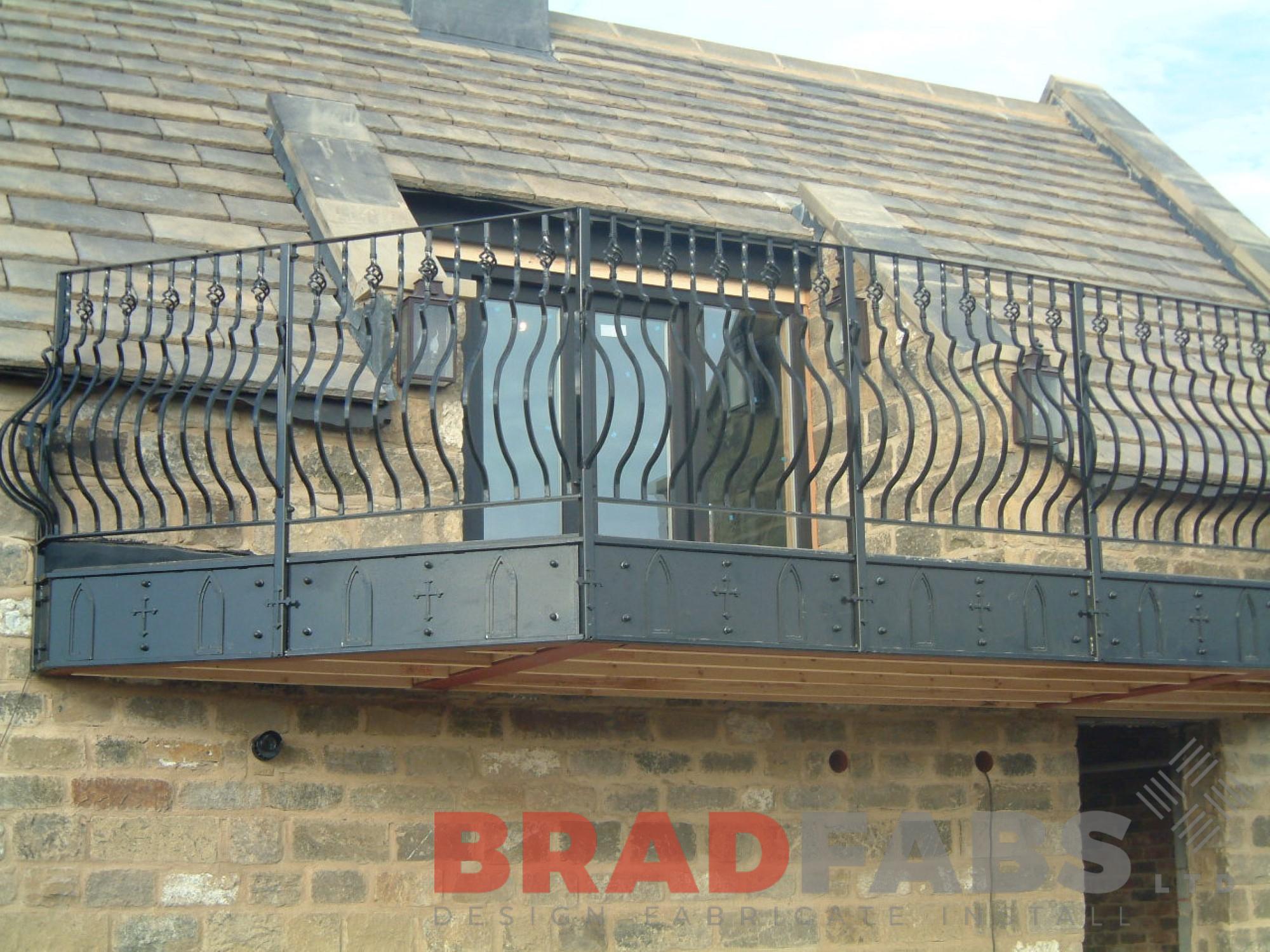 This extra large steel balcony features 'belly nose' balustrading, made from mild steel, galvanized and powder coated black which offers an excellent contrast to the stone building. Installed at a property in Leeds, West Yorkshire.