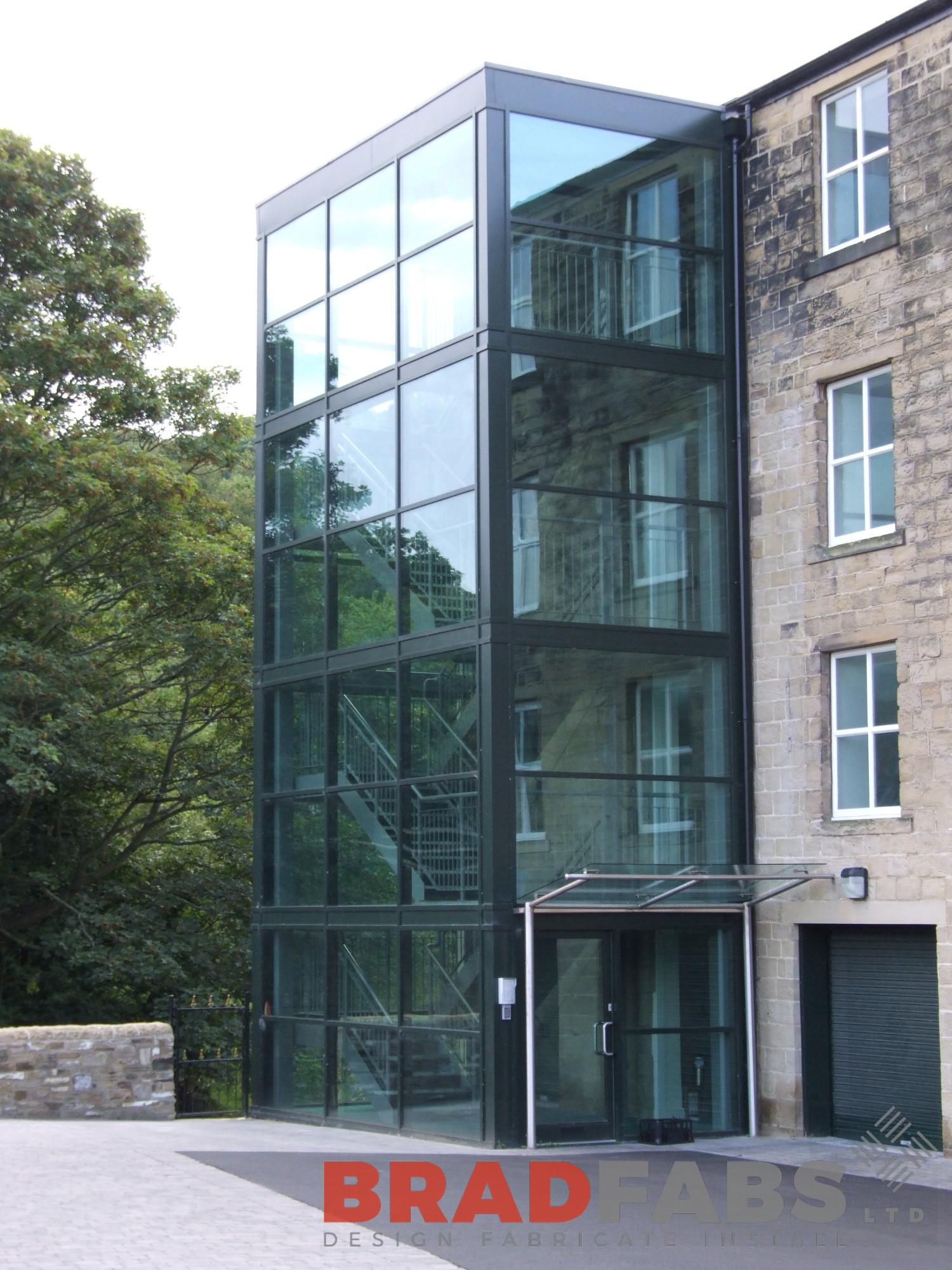 This doorway entrance canopy is fabricated in satin polished stainless steel tube with a toughened glass roof. This one off glass canopy is installed on the front of a large staircase at the entrance of a mill conversion in Pudsey, Leeds, West Yorkshire