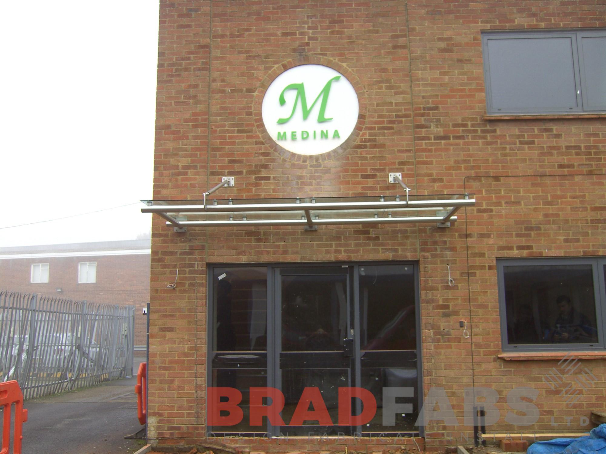 This single pane stainess steel canopy gives shelter to weather conditions for an office entrance doorway. The wall mounted canopy features two suspended supports and three wall brakects. Our installation team installed this tripple width doorway canopy at an office in Leeds.