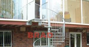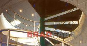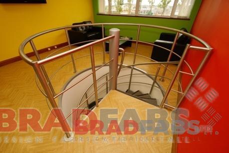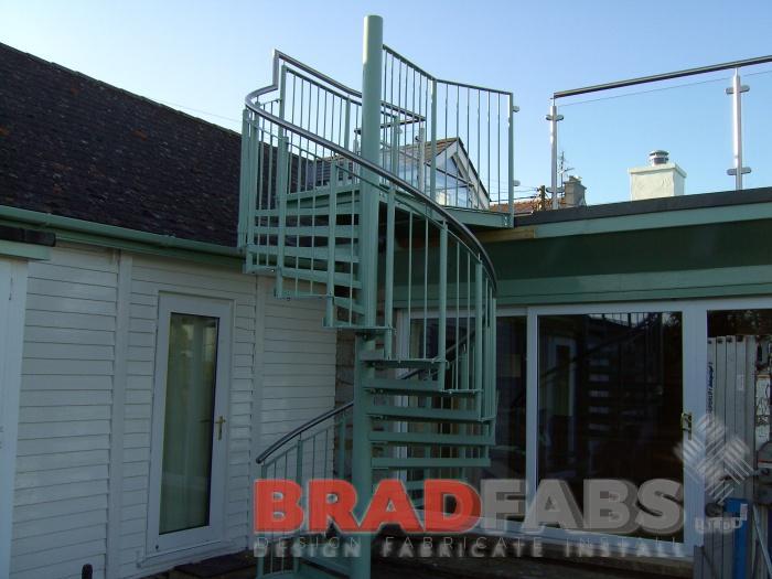 Bradfabs fabricated this bespoke spiral staircase and landing for offices in North Yorkshire to use as an emergency exit route. Made using galvanized mild steel with anti slip treads, featuring top and midrail balustrading up the side of the staircase and on the landing.