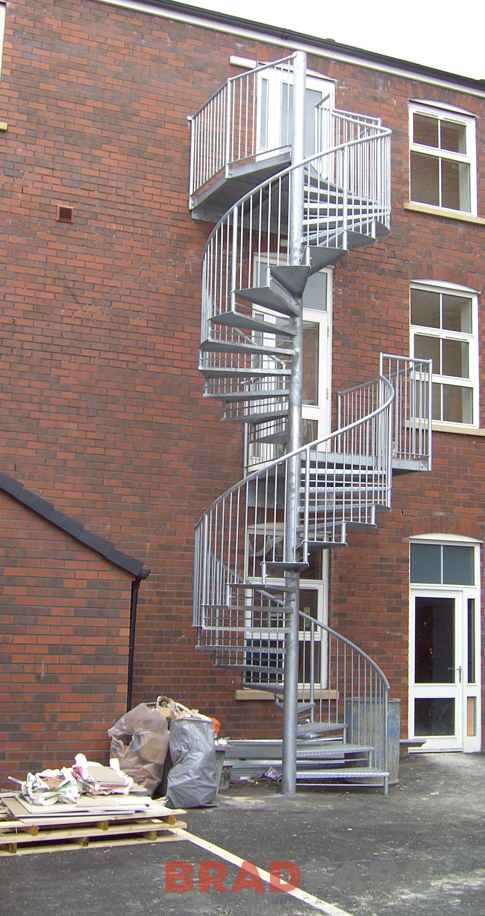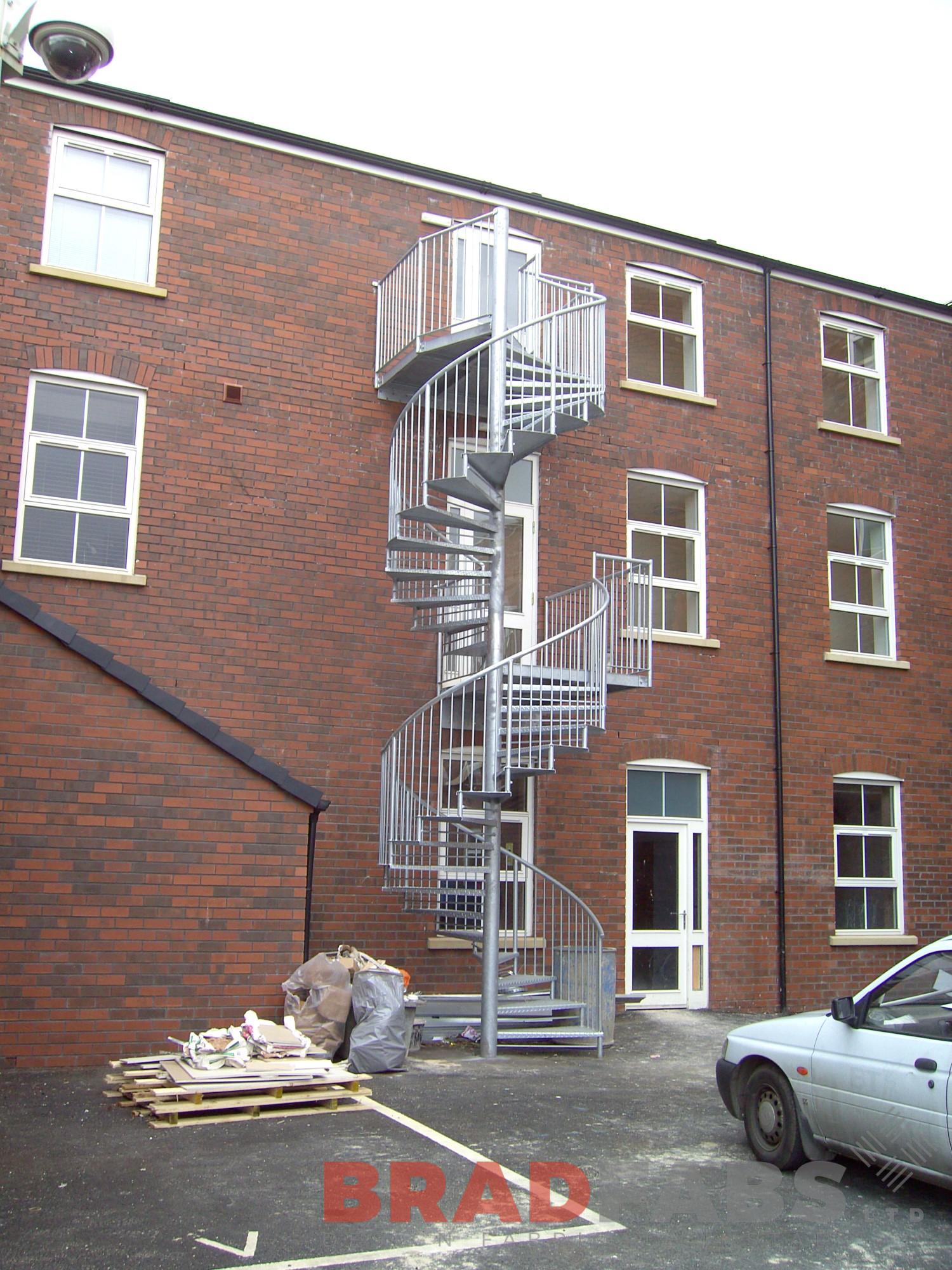 This emergency staircase is fabricated in galvanized mild steel providing weather protection in its external location. It features non-slip treads, provides exits to two levels with landings and can be installed or delivered in the UK.