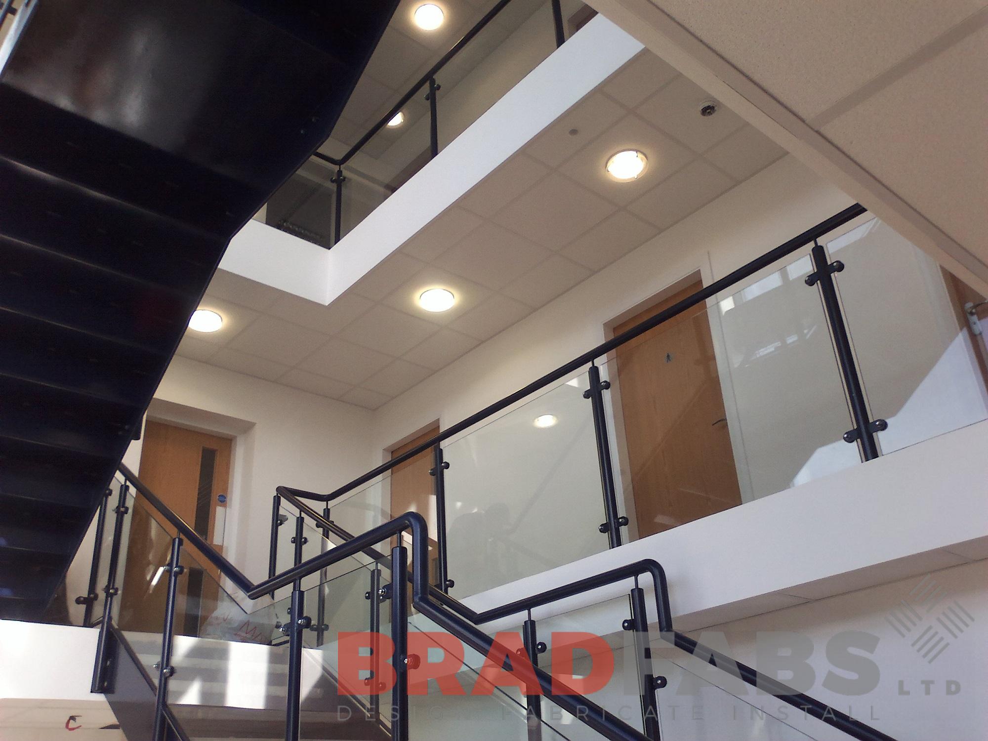 Bradfabs fabricated this steel staircase with mild steel stringers powder coated black with black steel and glass balustrade. Bradfabs also installed the balustrade around each landing area, this staircase goes up 3 flights inside offices in South Yorkshire.