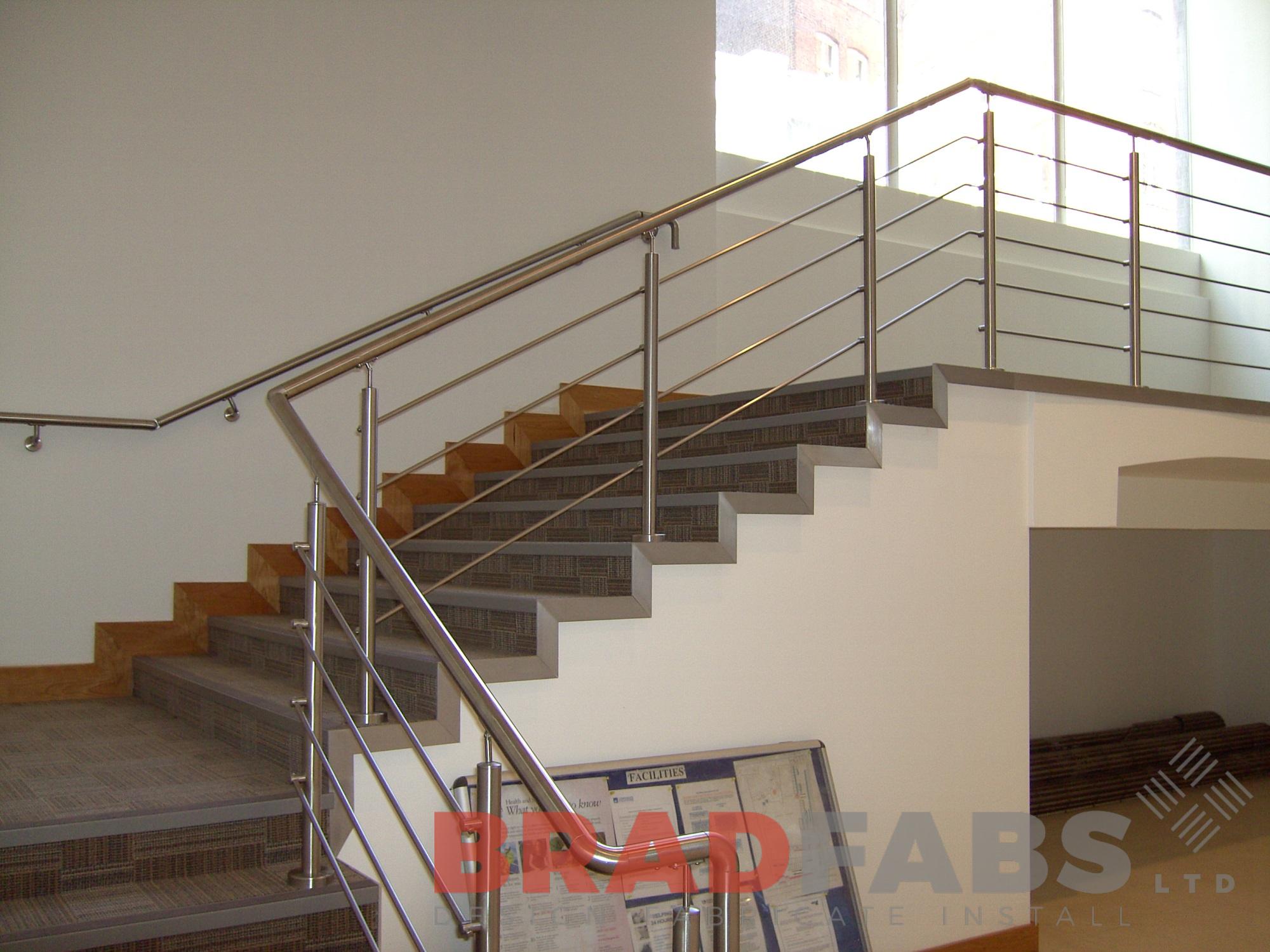 Here are the before and after images of this balustrades and handrails installation. It replaces and significantly modernises the outdated coloured glass and steel balustrading with satin polished stainless steel balustrading and is installed at offices in Manchester, Lancashire.