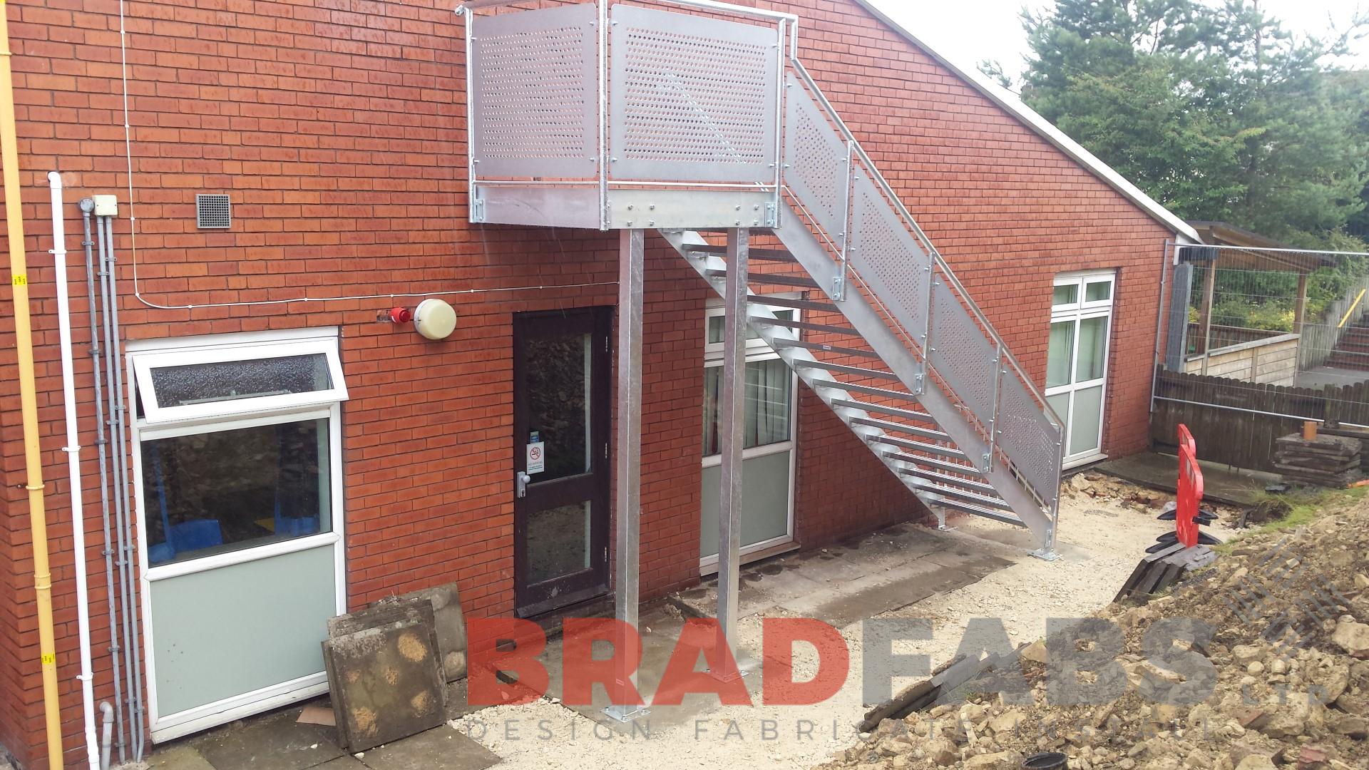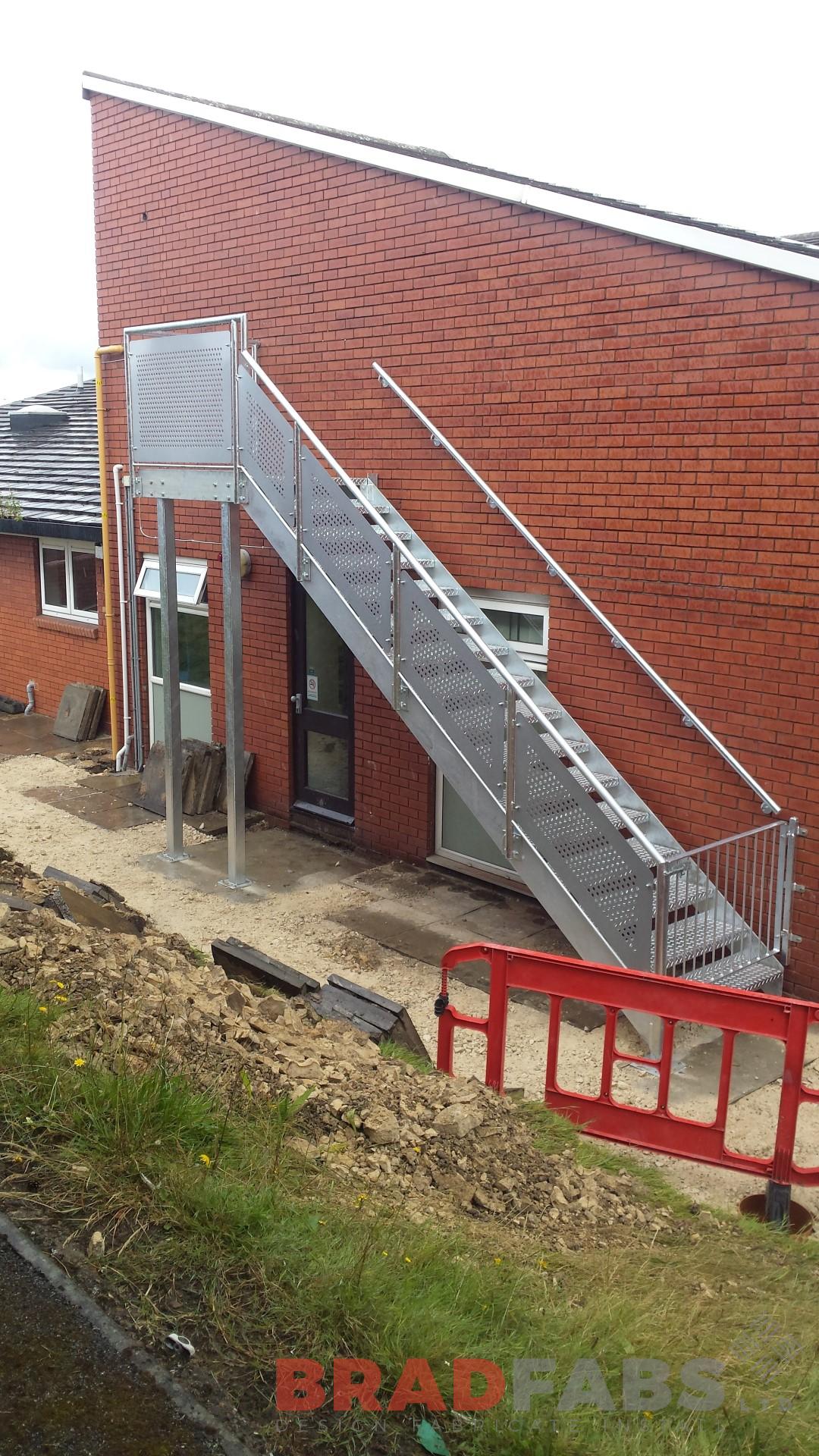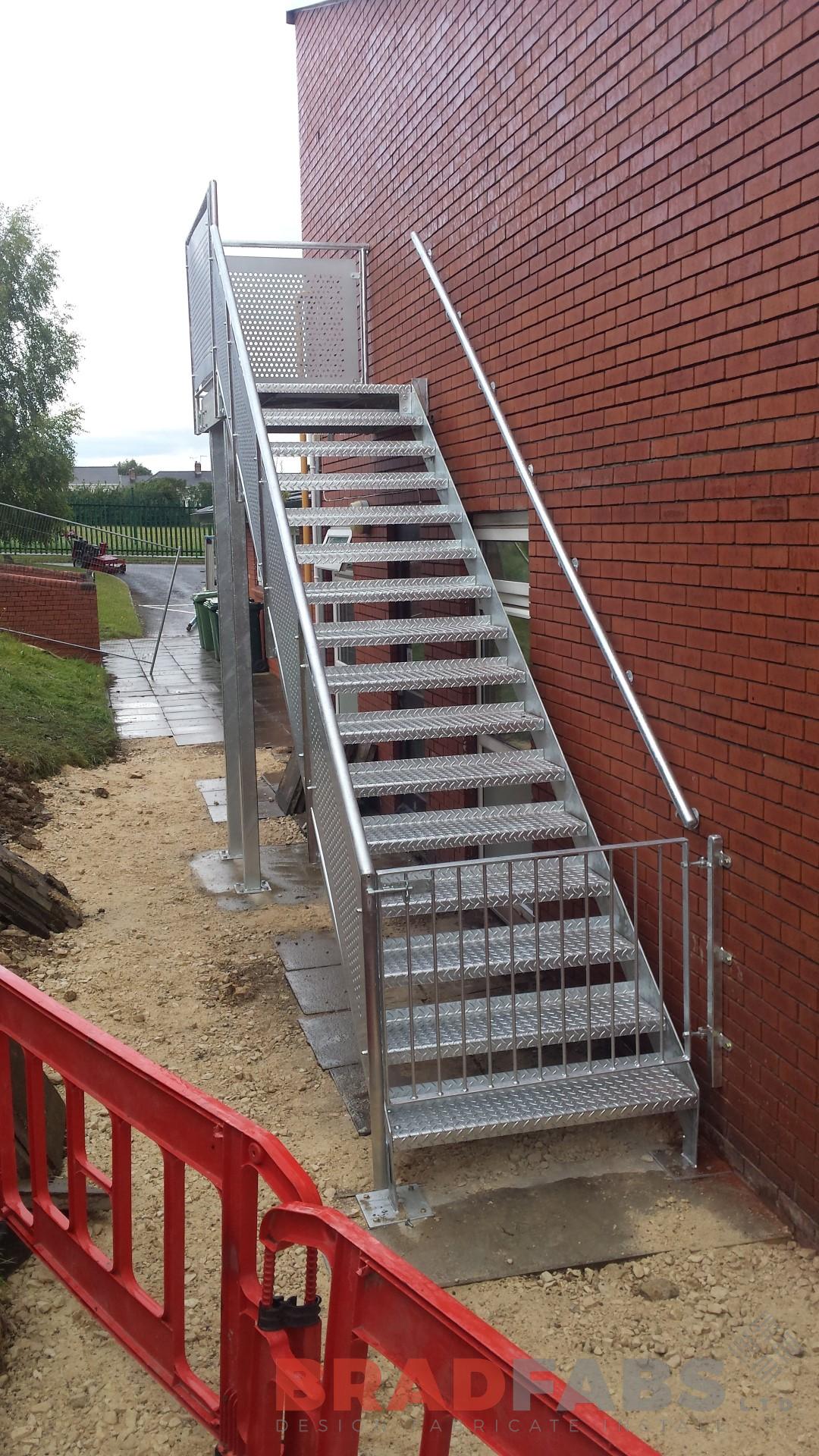 Bradfabs manufactured this straight staircase for a local construction company who work closely with many local schools, this one is particular was for a local Primary School fabricated in mild steel, galvanised complete with perforated laser cut panels and durbar treads