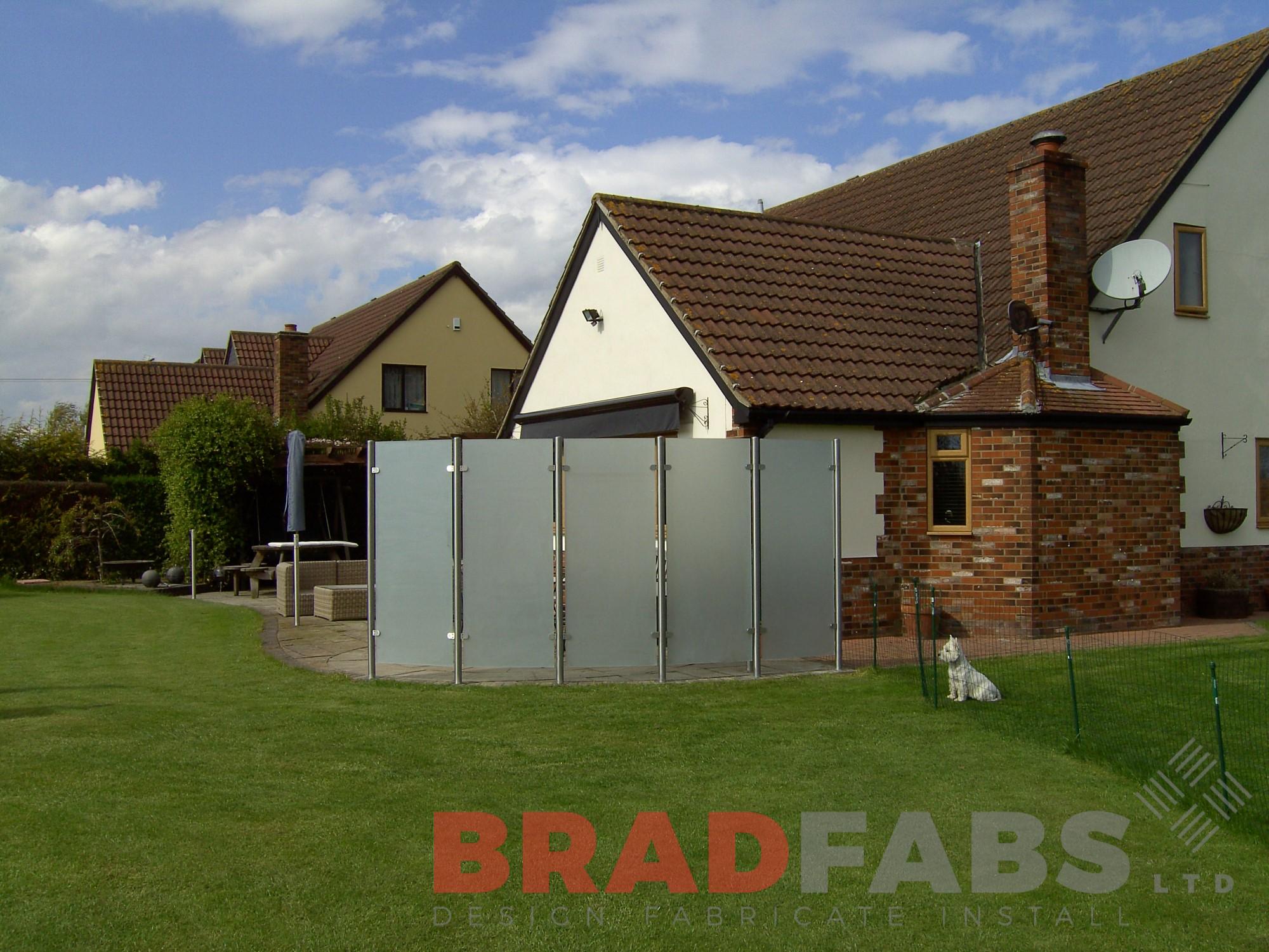 This frosted glass screen creates privacy for the home owner from the local public house which overlooks their patio area and also provides good wind shelter when dining. It is fabricated in stainless steel and is installed in London.