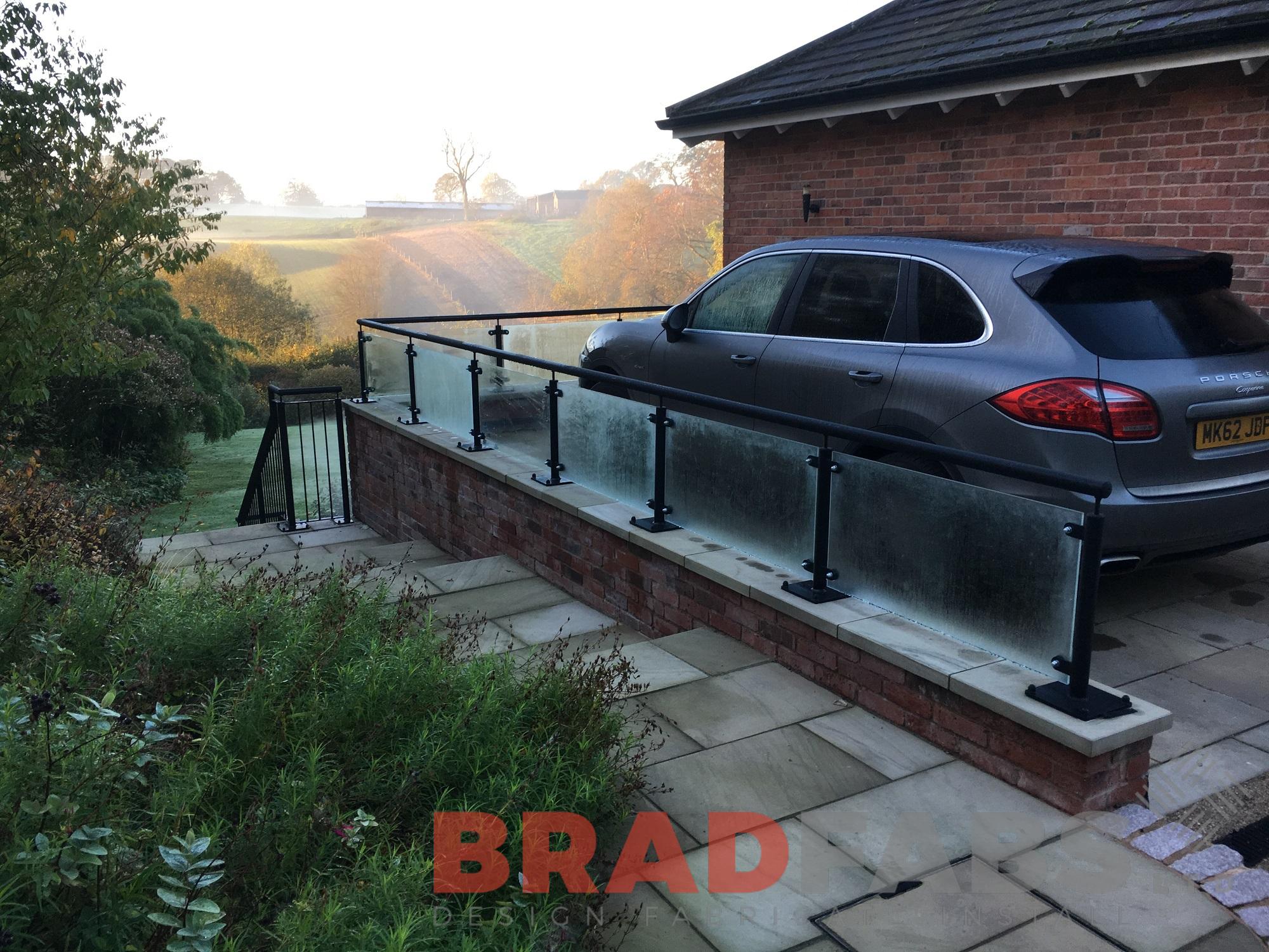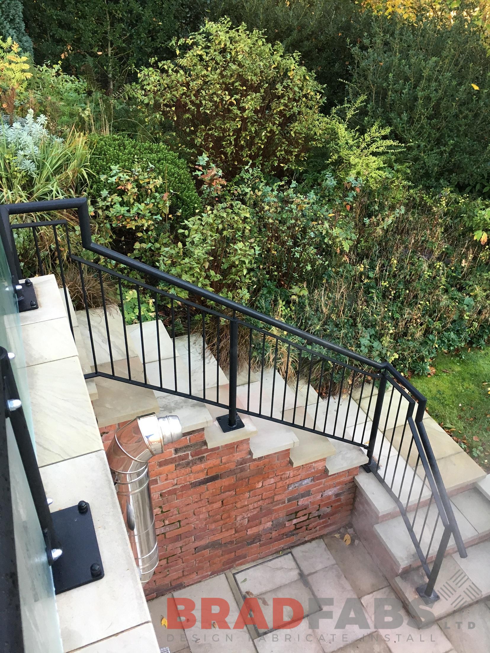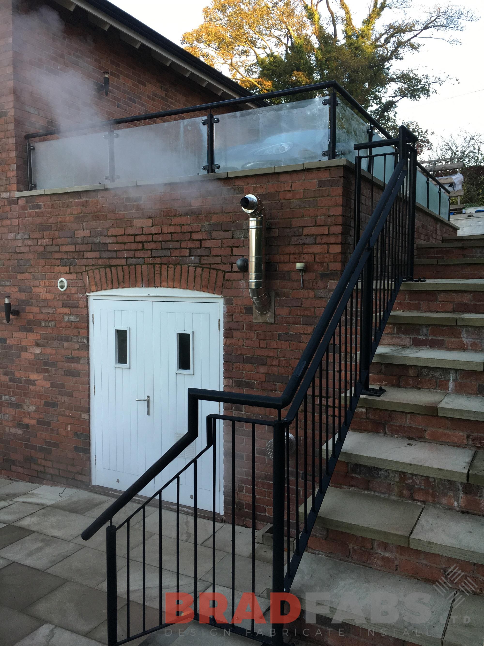 Beautiful outdoor home improvements with this balustrade and railings mild steel, galvanised and powder coated with glass infill panels, then vertical bar balustrade on the stairs.