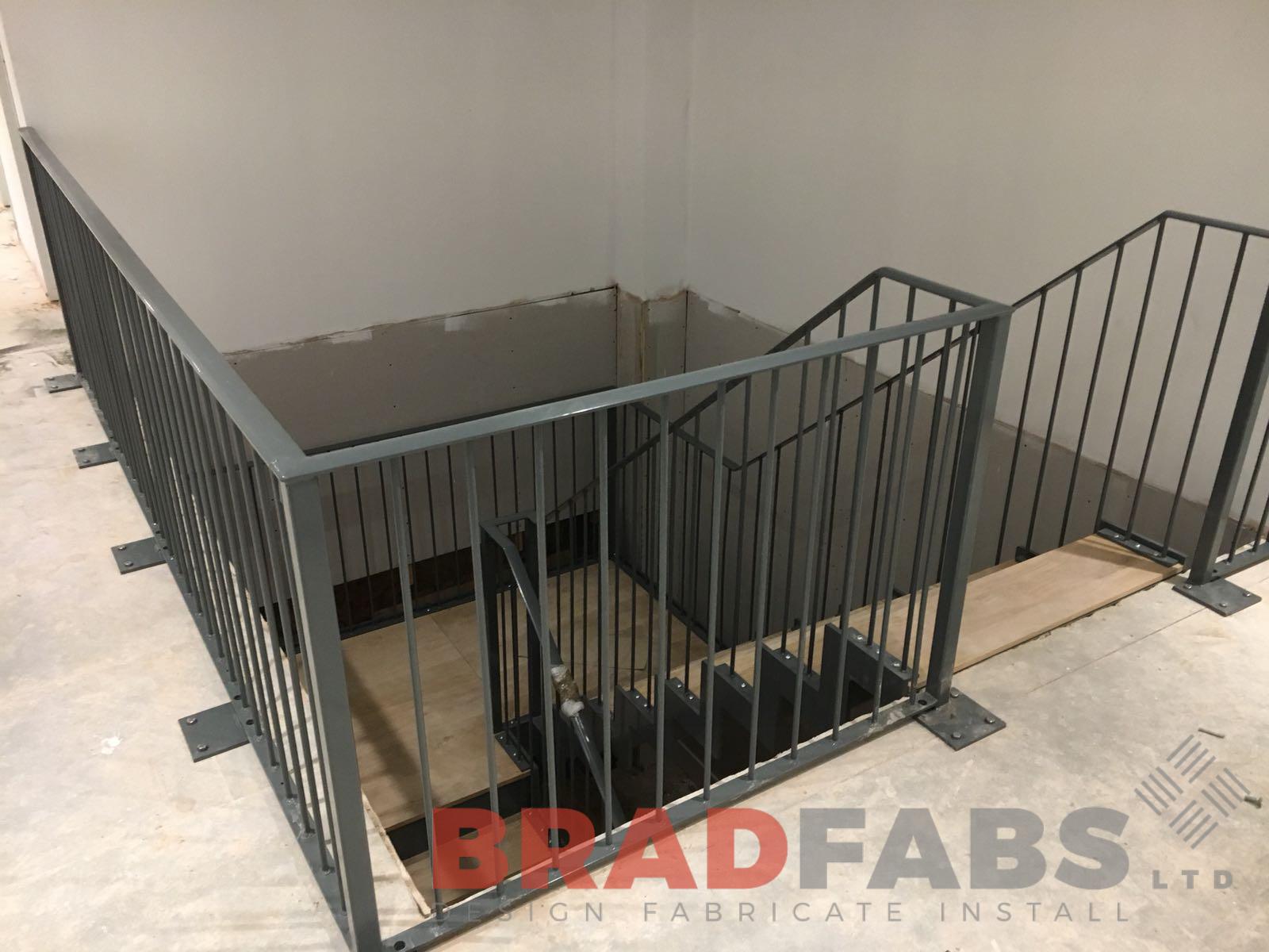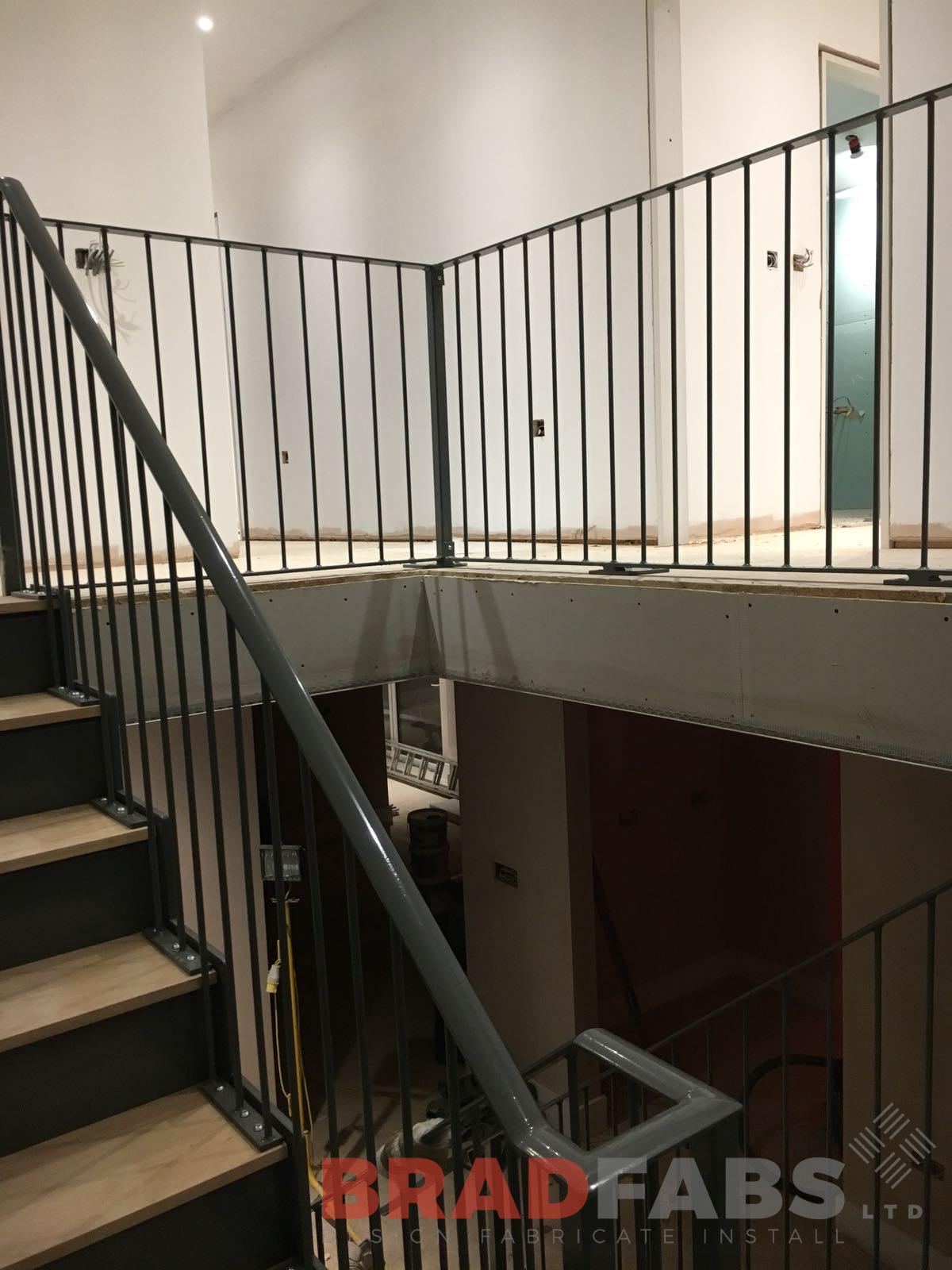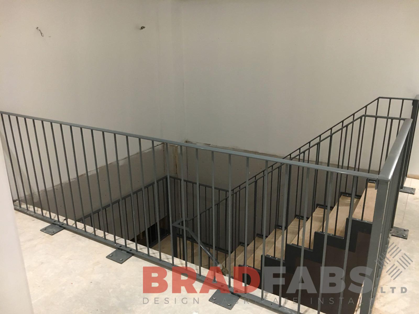 Saw tooth stringer bespoke staircase with vertical bar balustrade and convex flat bar handrail
