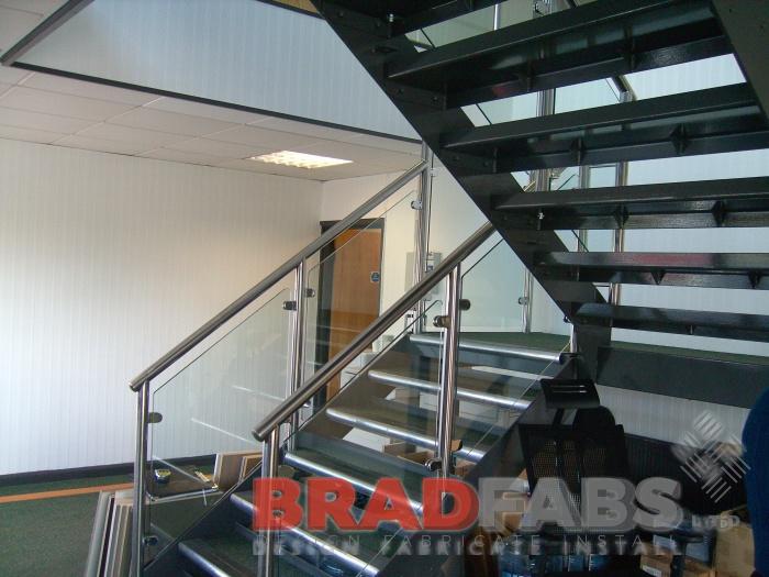 This mild steel and glass staircase features a single landing with galvanized stringers, polished stainless steel balustrading. The staircase treads and risers are fabricated in mild steel then powder coated and are installed at offices in Leeds, West Yorkshire.