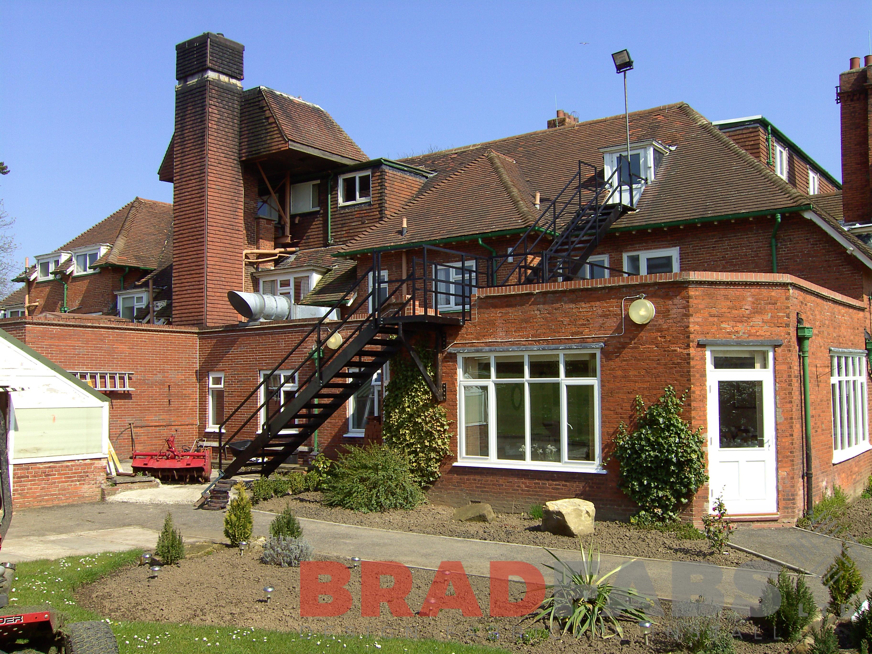 Designed to provide emergency exits at two levels including roof access stairs, this mild steel staircase is galvanized and painted black. It features one accessible landing area and designed to Building Regulations in the UK.