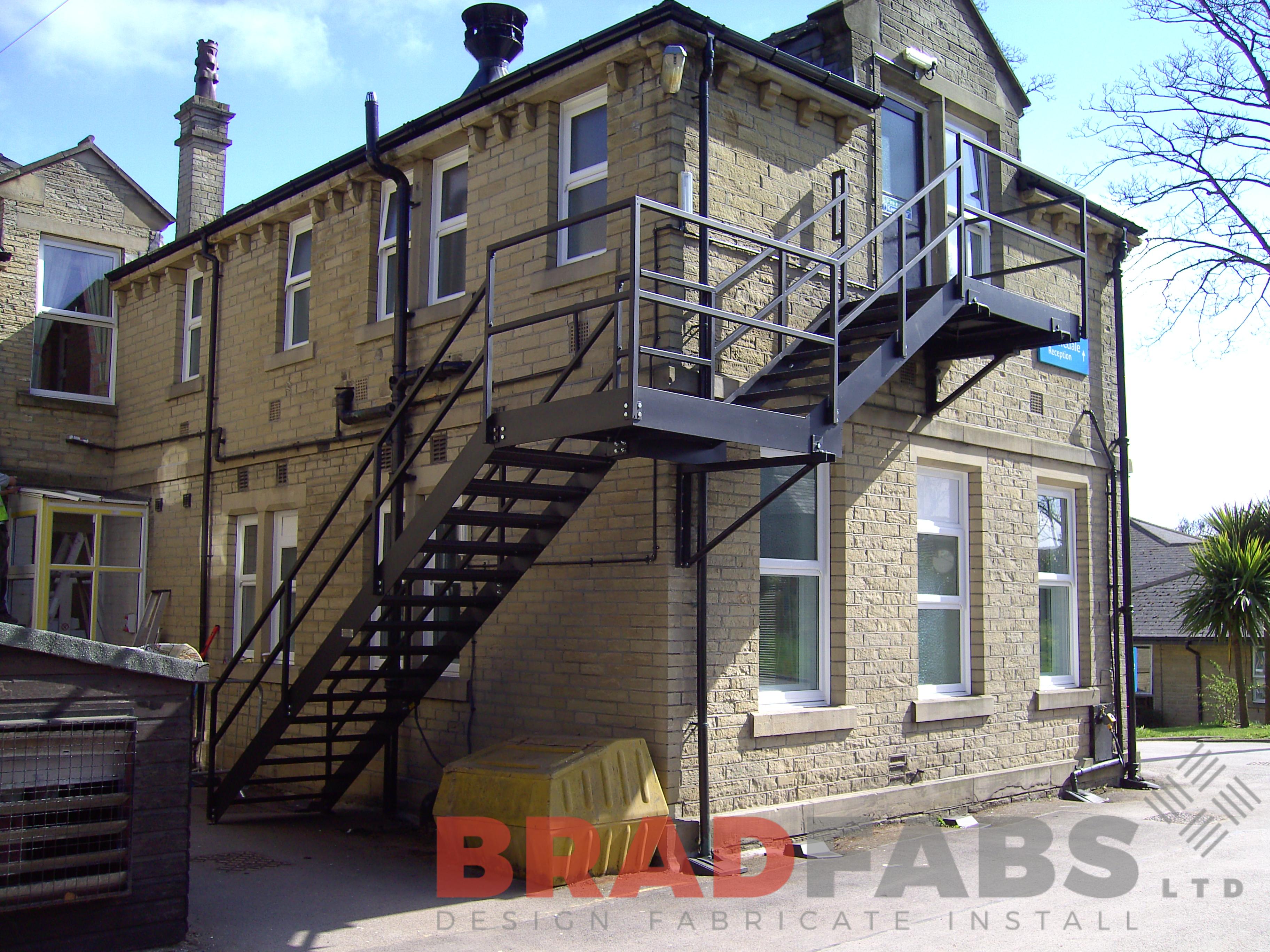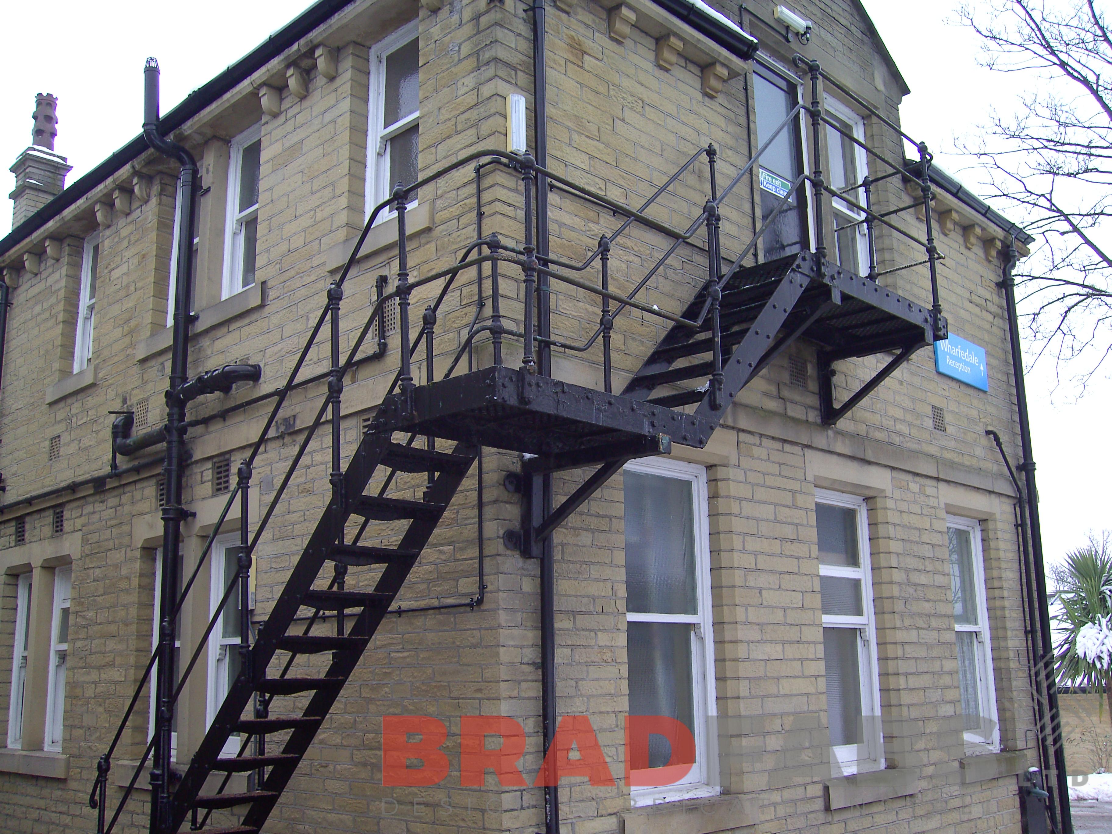 This L shaped fire escape design wraps around this listed building with two landing areas. This example is fabricated in mild steel, galvanized and painted black to replace an existing fire escape.