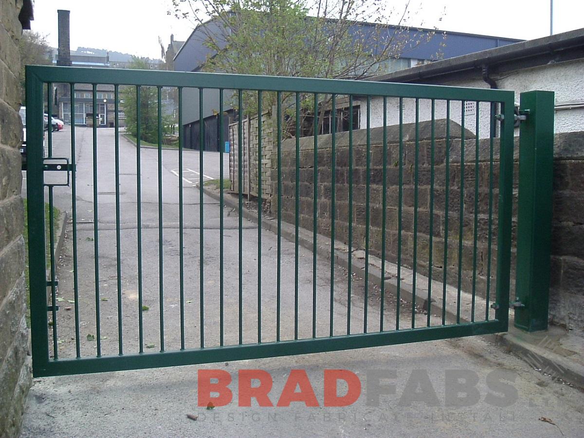 This car park access gate with lock is fabricated in mild steel, then galvanized, powder coated green and is installed at Ilkley Grammar School, Ilkley, West Yorkshire.