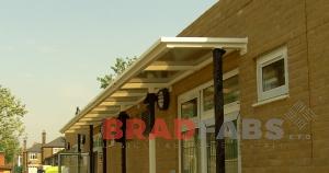 This galvanized mild steel school canopy provides shelter for the side access path of the school building with its bronze tinted polycarbonate roof sheets. The single width canopy is powder coated white and installed at Altmore School, East Ham, London.