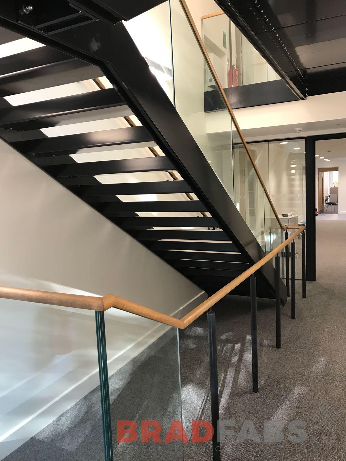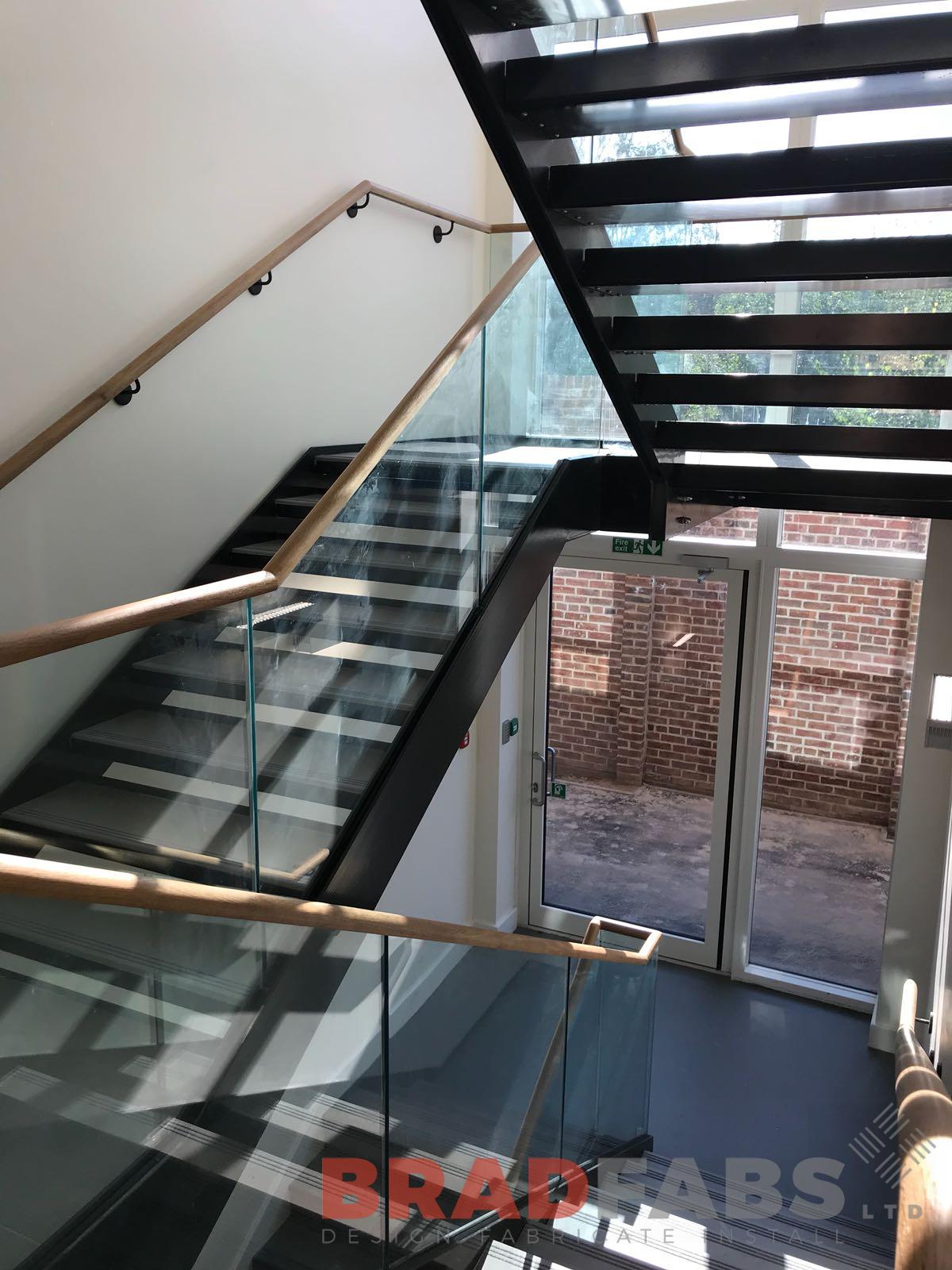 This school required a modern yet practical staircase to be installed over the summer holidays, they have chosen a glass balustrade with a wooden handrail, closed treads on the first flight and open treads on the second.
