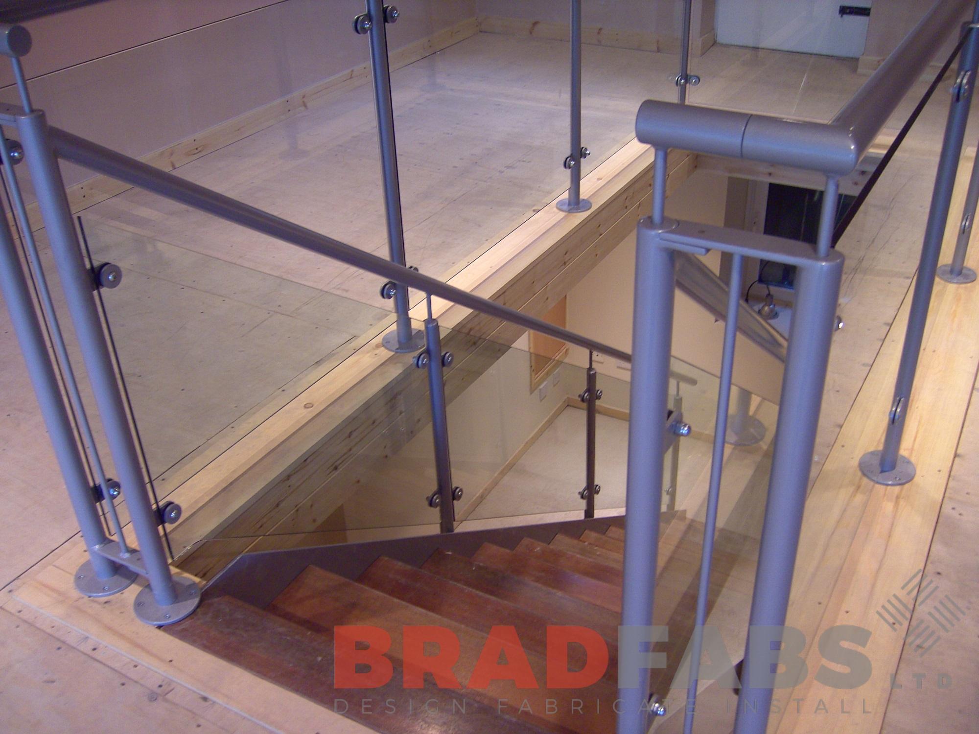 The staircase features mild steel strair stringers and handrails, which are powder coated grey. The staircase also includes glass balustrading, timber stair treads and is installed inside a shop in Harrogate, North Yorkshire.