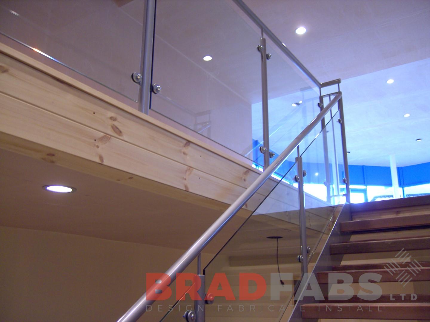 This stair balustrading is fabricated in mild steel, which is powder coated grey and features glass panels and handrails. This modernized balustrading also gives strong and safe access between floors and is installed at a retail shop in Harrogate, North Yorkshire.