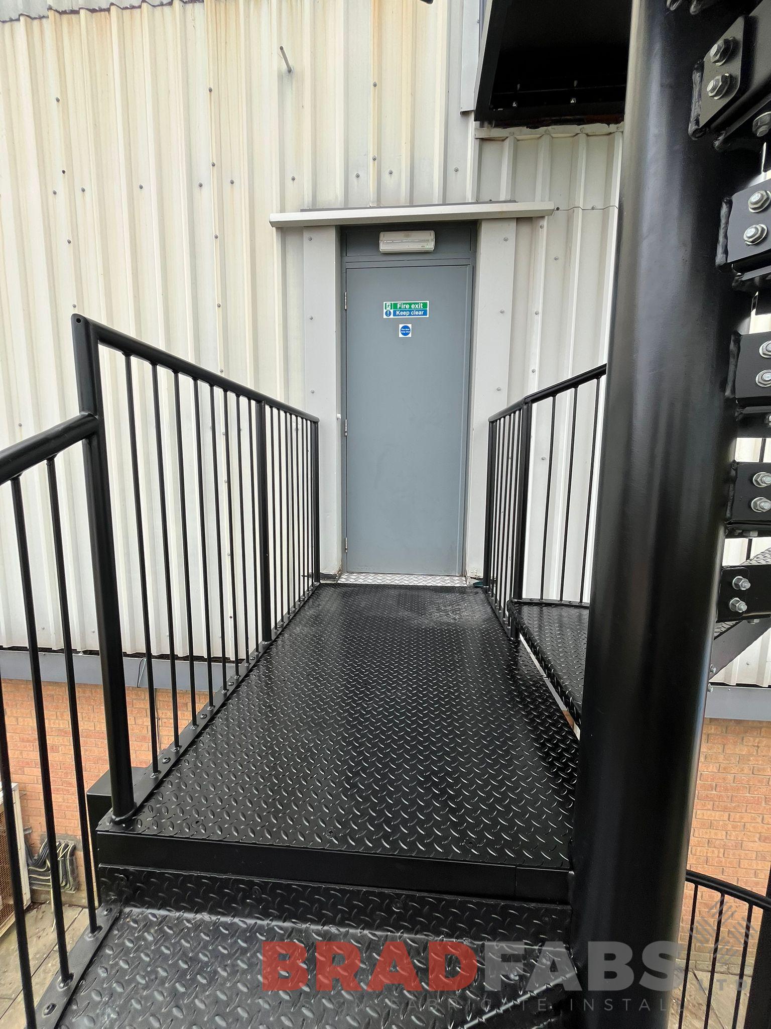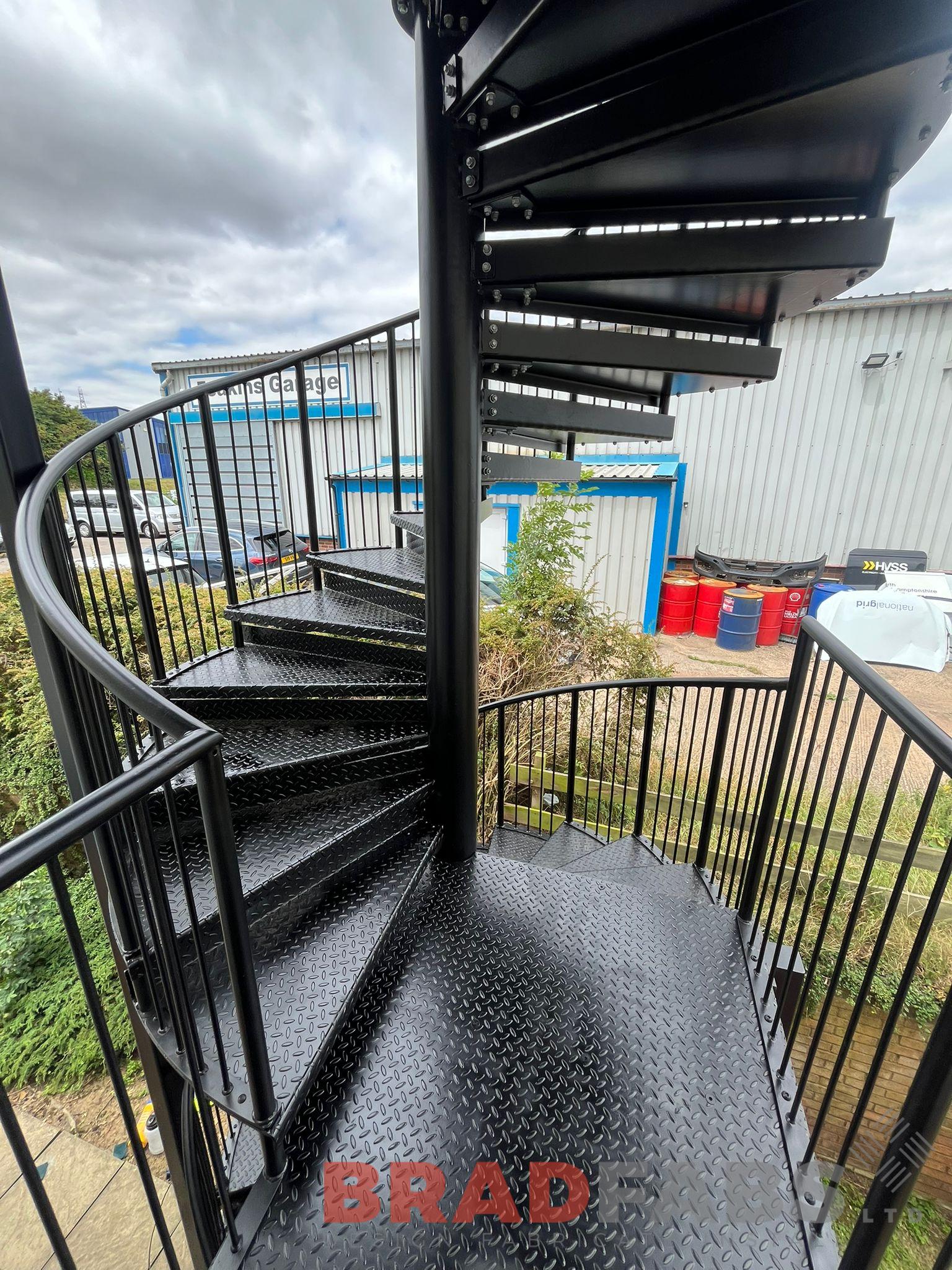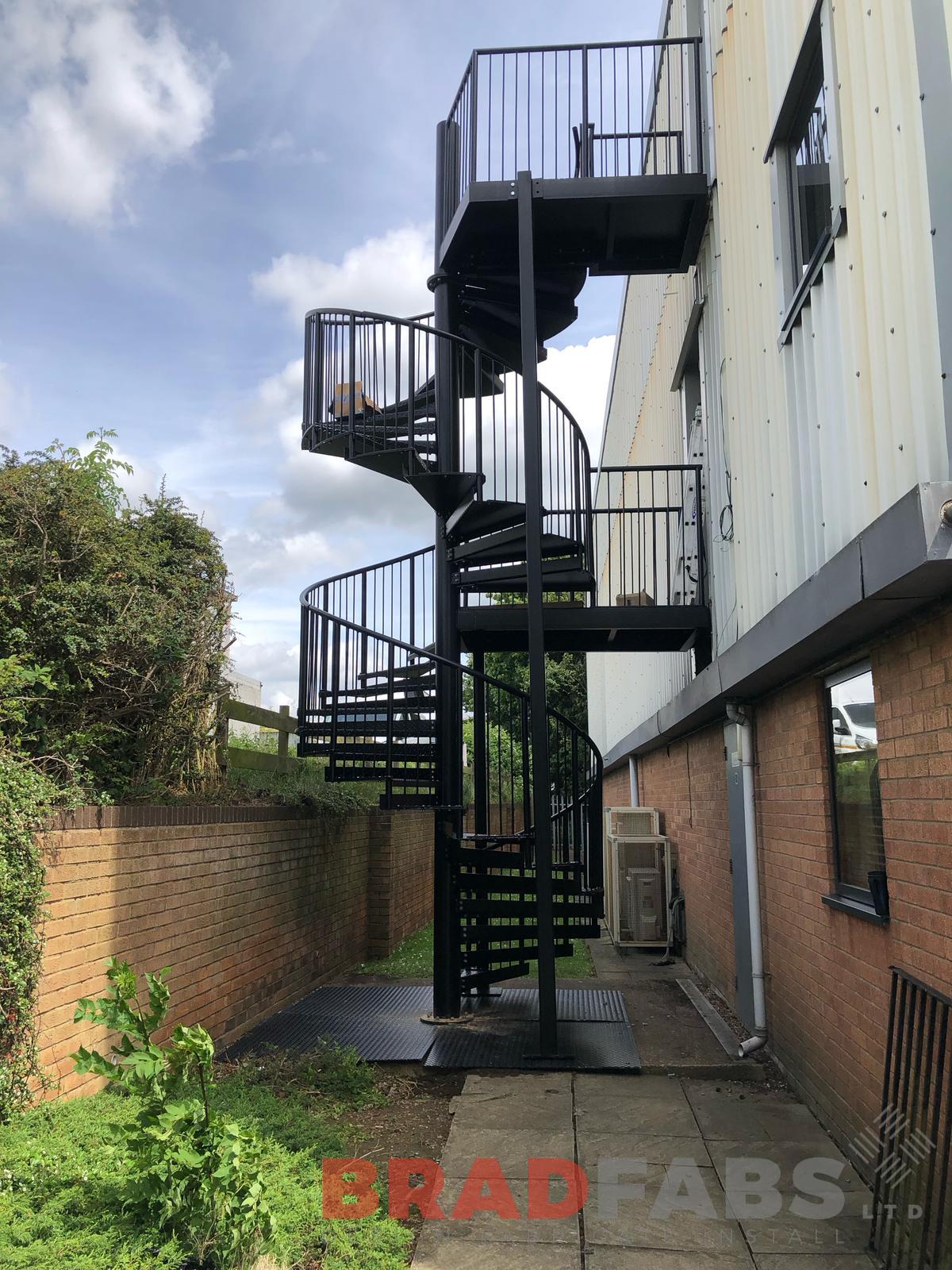 We supplied and installed a new galvanised and powder coated spiral fire emergency staircase with 2 no exists. With a central column and durbar treads and landing complete with vertical bar balustrade.