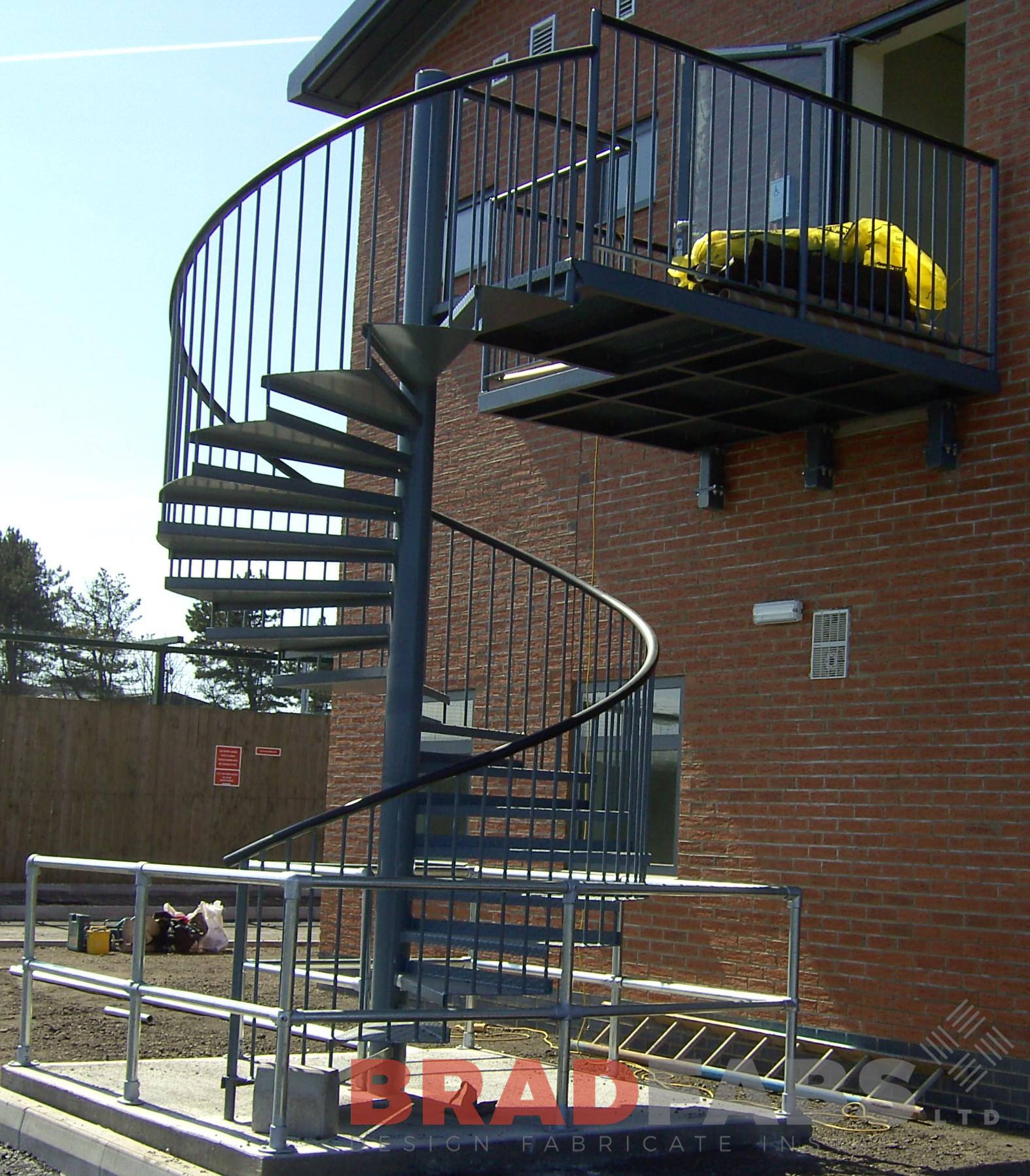 This spiral fire escape is fabricated to provide exit through a single non-slip landing and durbar stair treads. It also features a ground floor protective rail and a warm-to-touch plastic handrail capping. It is galvanized, powder coated grey and installed at offices in Whitby, East Yorkshire.